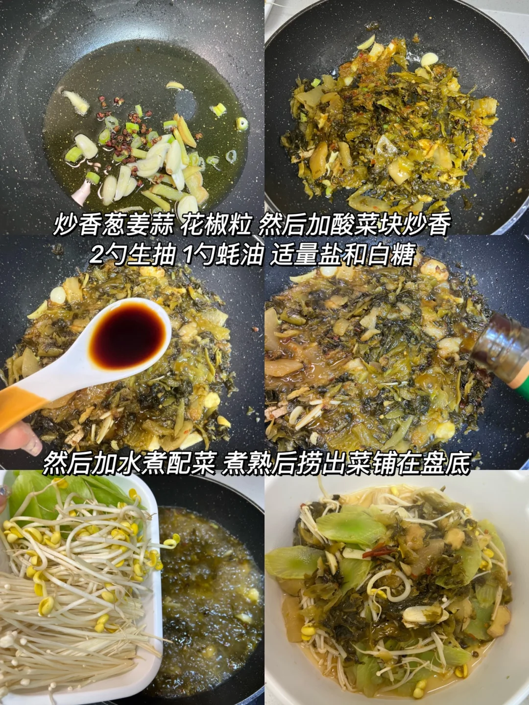 2️⃣锅里热油炒香葱姜蒜和花椒粒,然后加酸菜炒香,加入生抽 蚝油 盐和糖调味,然后加入热水,再下配菜煮熟捞出铺在盘底
