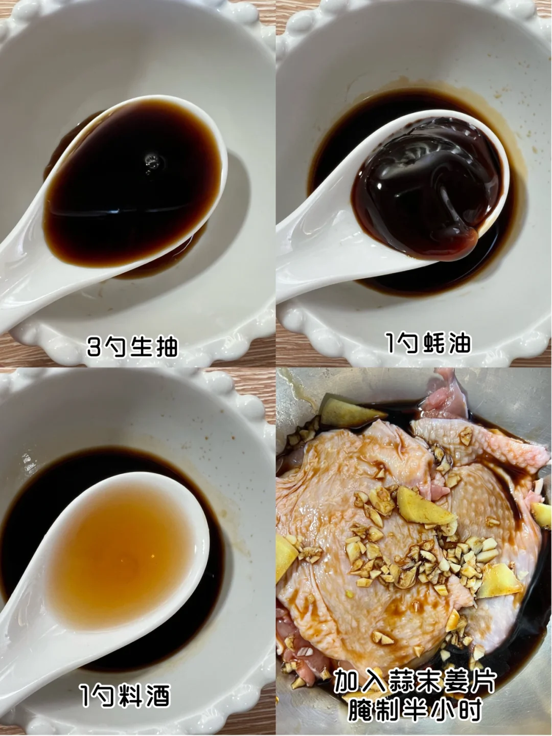1️⃣鸡腿肉加入料汁(图4)腌制30分钟以上,然后锅里刷油鸡皮朝下煎到金黄后翻面再煎2分钟