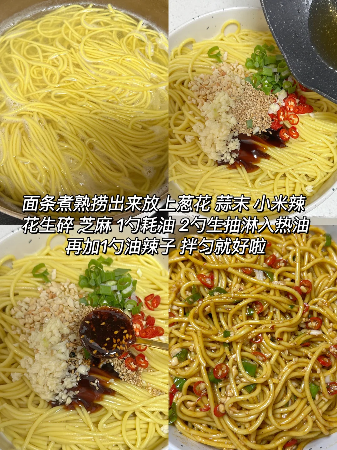 1️⃣ 面条煮熟捞出来放上葱花 蒜末 小米辣 花生碎 芝麻 1勺耗油 2勺生抽淋入热油