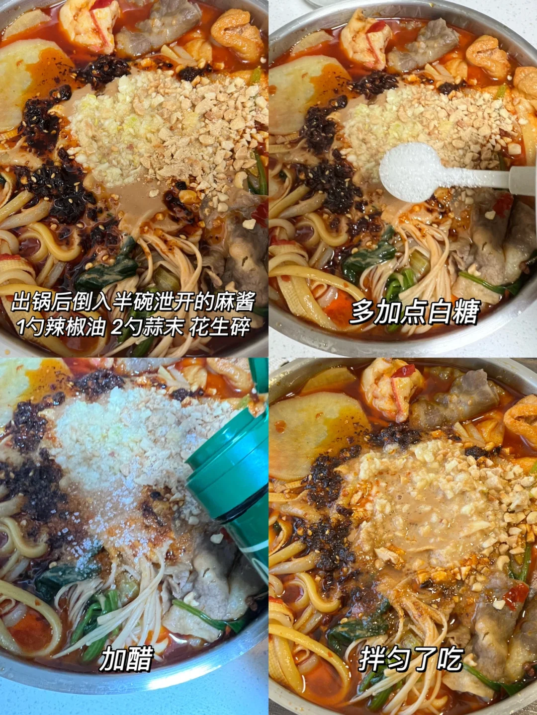 2️⃣都煮熟以后盛到碗里,然后上面倒半碗泄开的芝麻酱(我还加了点花生酱),然后撒花生碎,白糖,醋,辣椒油,这些都根据自己口味加,然后嚯嚯匀了吃