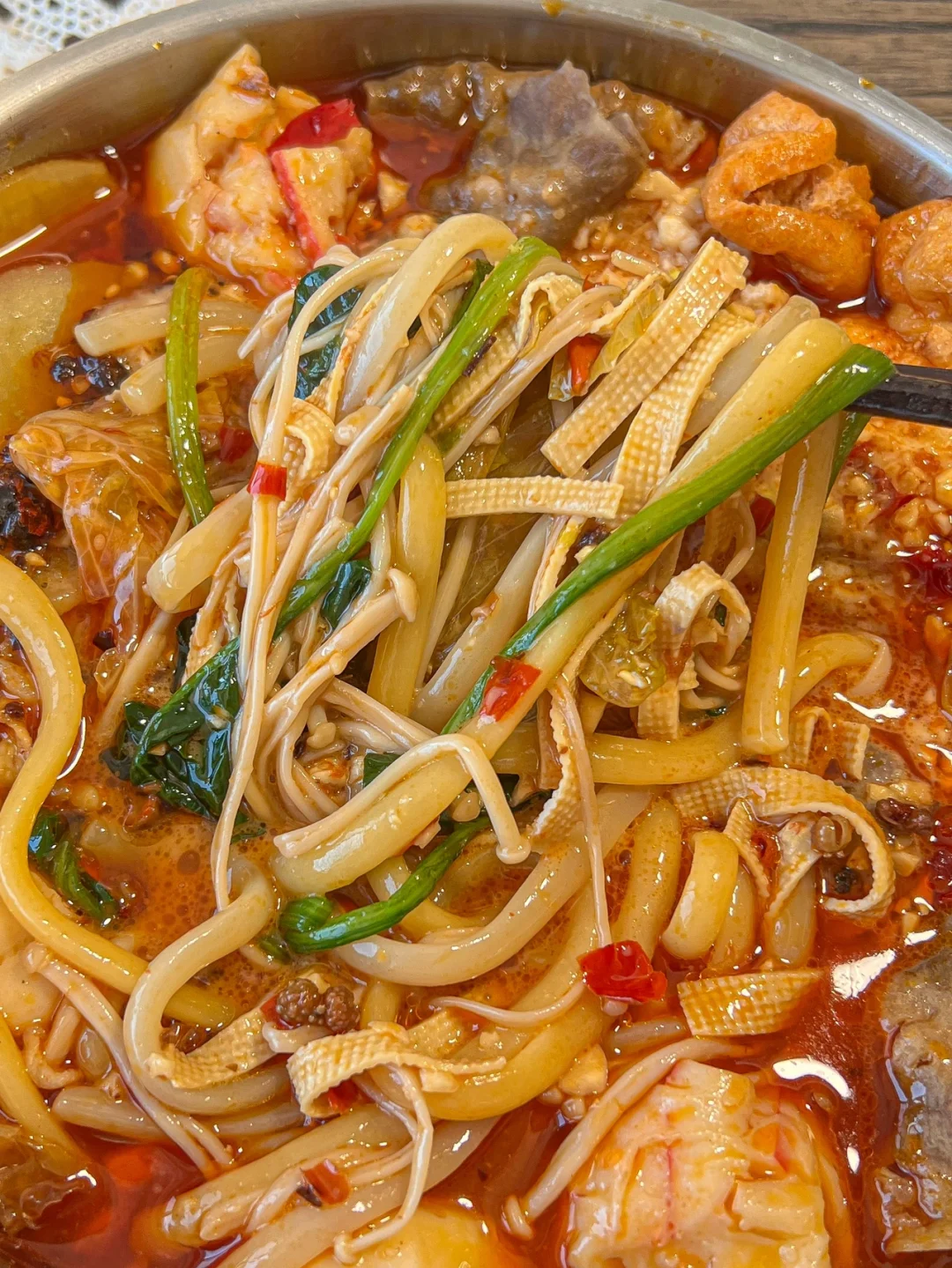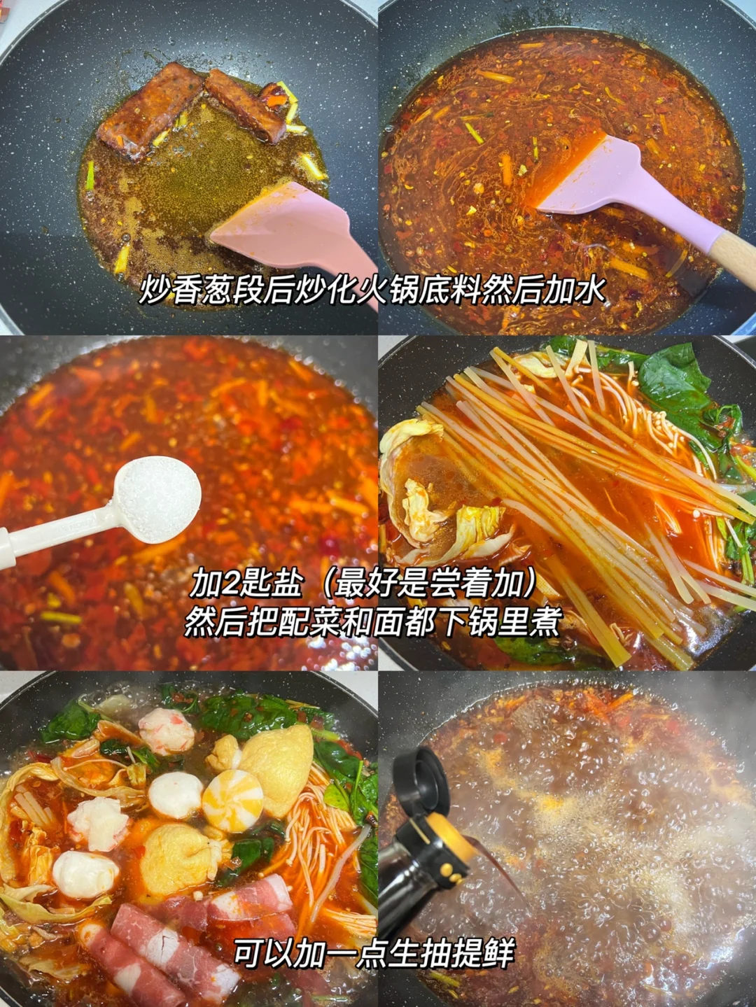 1️⃣锅里热油炒香葱段然后加火锅底料炒化,然后加水,加一点生抽和盐调味,水开以后把食材都下进去,要先下那个面,比手擀面难煮,煮1分钟再下菜(别问我怎么知道的...)