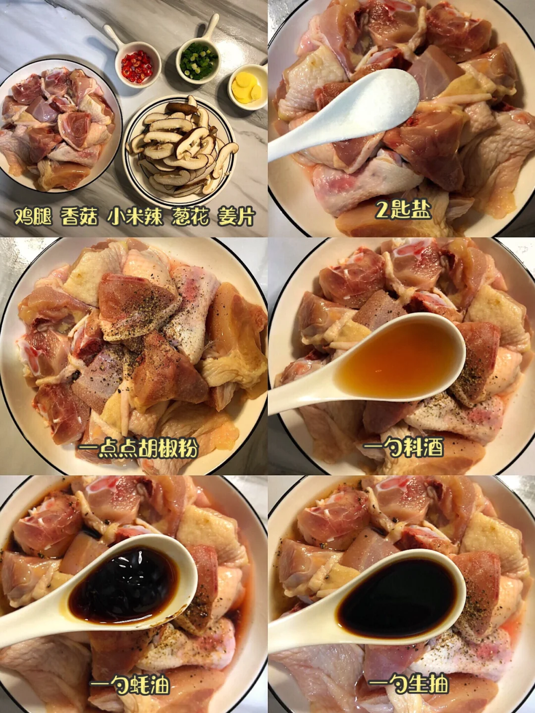 1️⃣鸡腿剁成小块儿,加两匙盐,一点点胡椒粉,一勺料酒(5g),一勺蚝油,一勺生抽,半勺香油,半勺老抽,两勺淀粉,加上姜片和切好的香菇片抓拌均匀