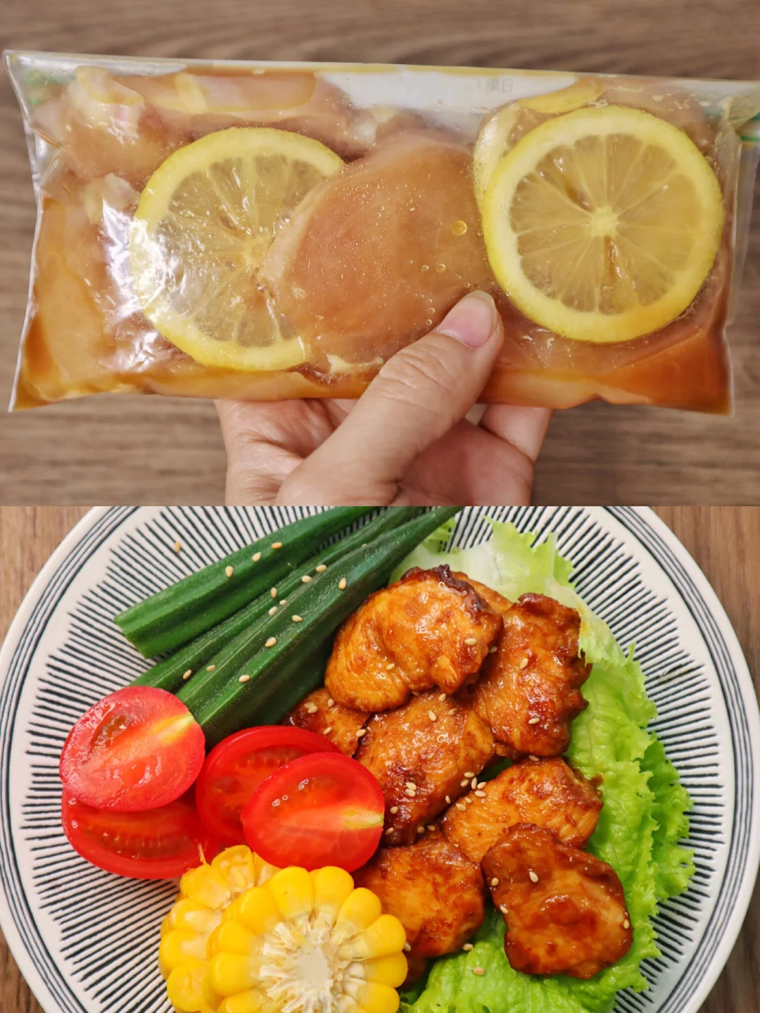 💕要腌制至少30分钟再煎哦,煎的时候锅里刷一层薄油就可以了,小火慢煎到筷子一戳就透就是熟啦,我喜欢搭配一些蔬菜当做晚饭一起吃