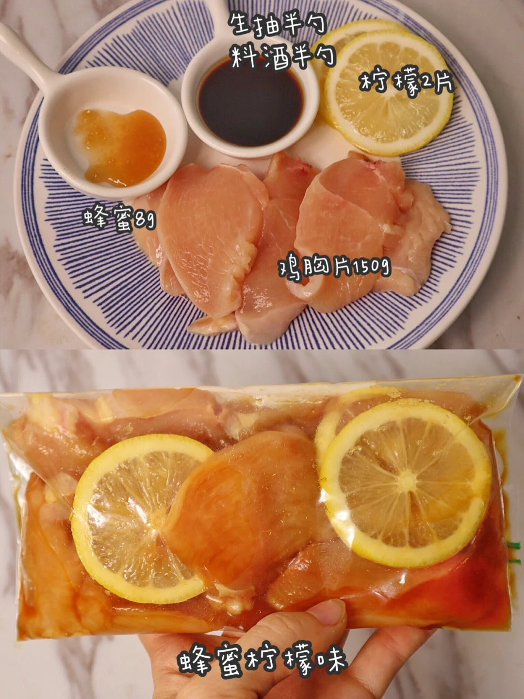 生抽料酒各半勺,柠檬2片,蜂蜜8g,鸡胸肉150g