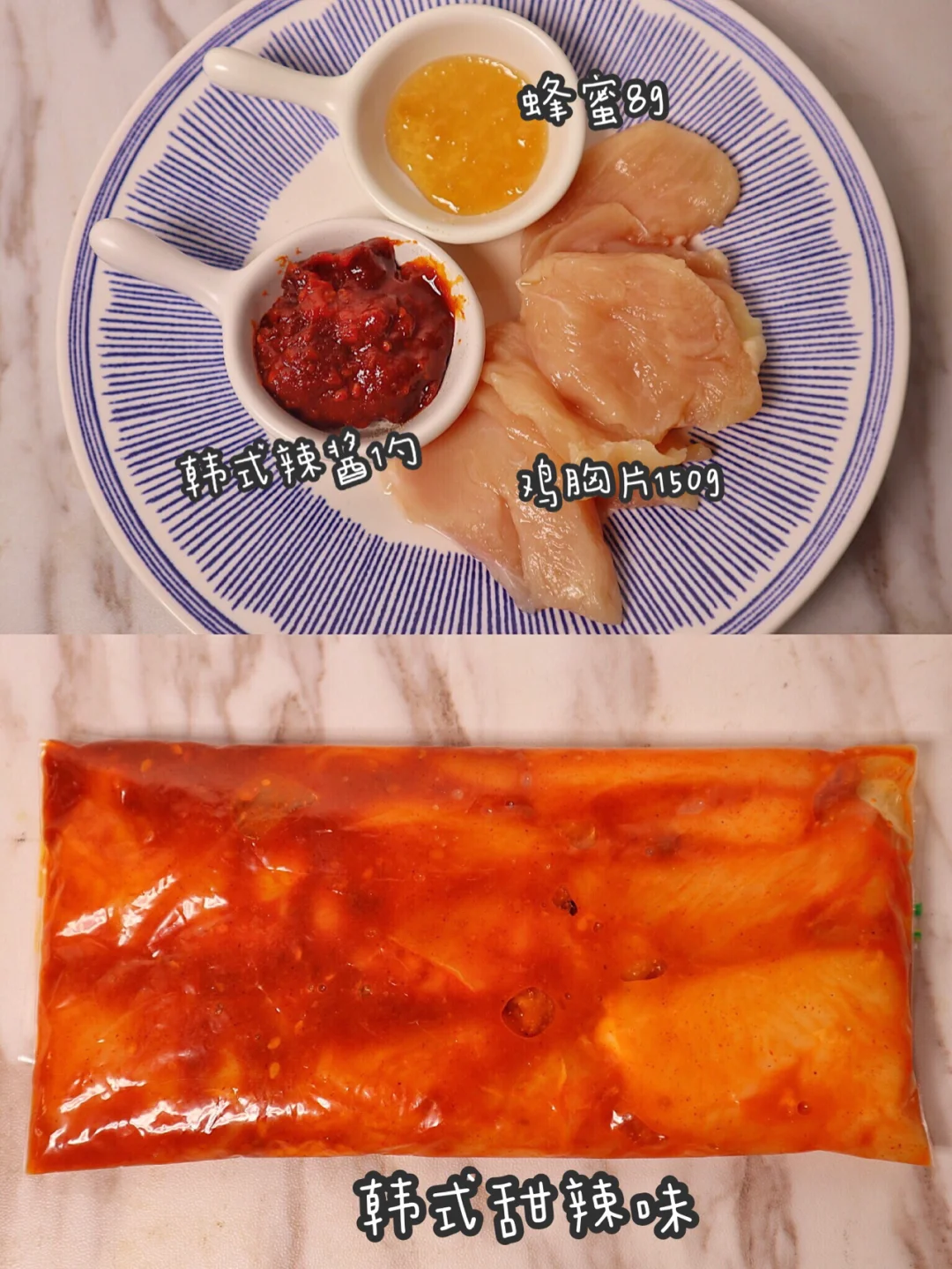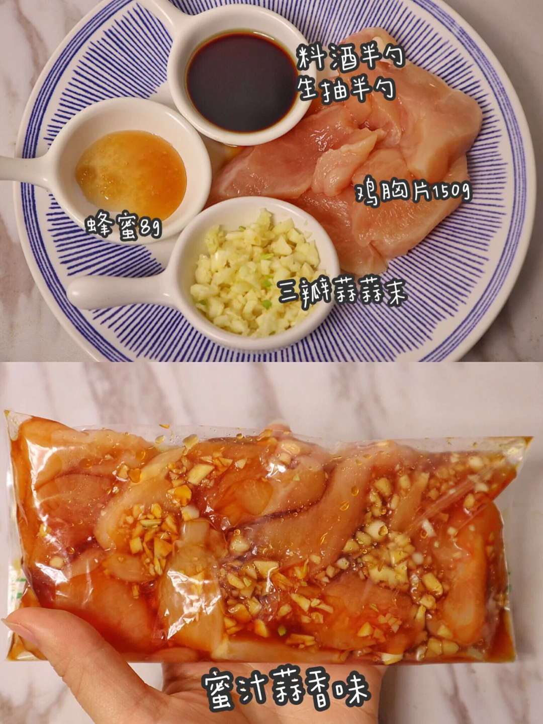三瓣蒜蒜末,蜂蜜8g,料酒生抽各半勺,鸡胸150g