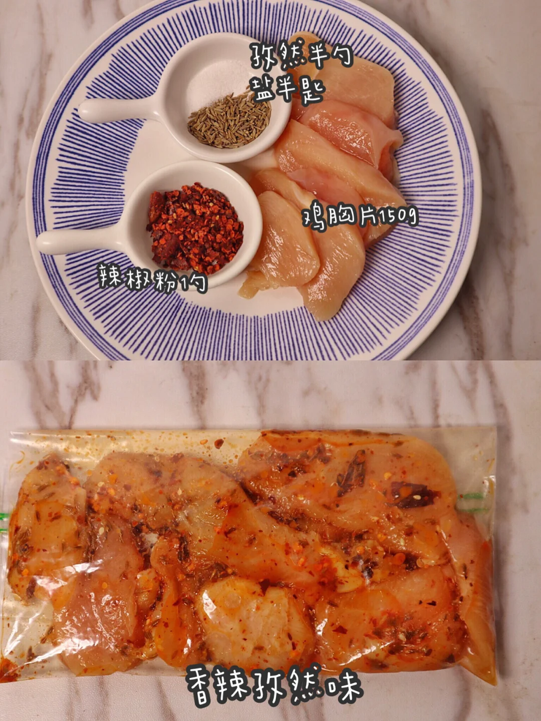 孜然半勺,盐半匙,辣椒粉一勺,鸡胸肉150g