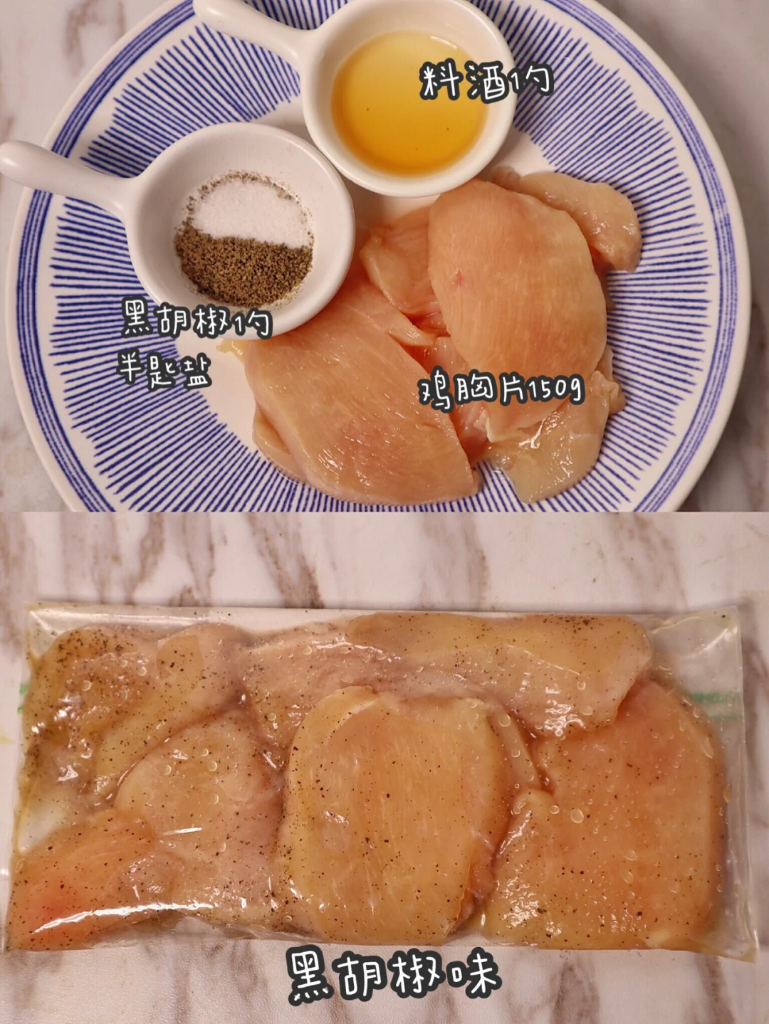黑胡椒粉一勺,盐半匙,料酒一勺,鸡胸肉150g
