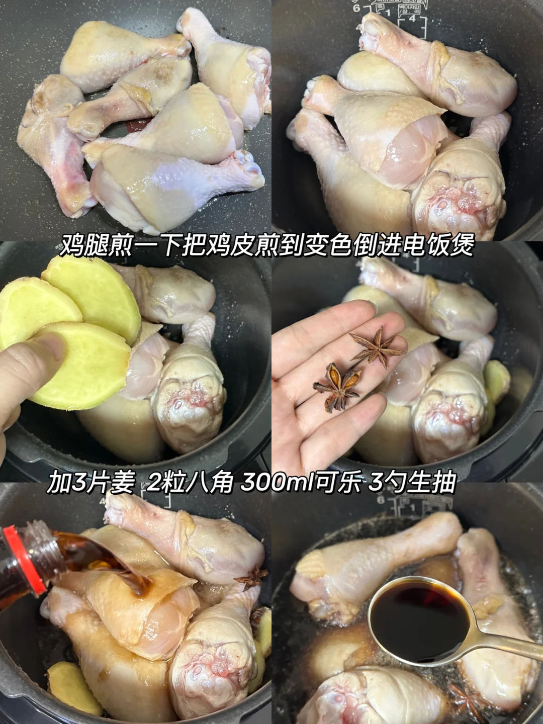1️⃣鸡腿煎一下把鸡皮煎到变色倒进电饭煲里