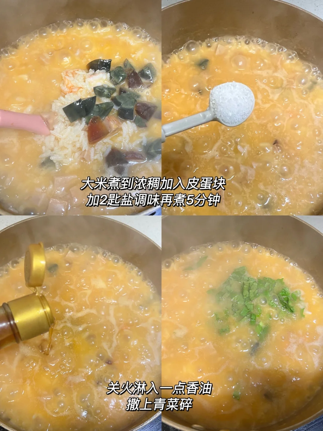 3️⃣然后加入大米煮10分钟左右变得膨胀浓稠,下入皮蛋再煮5-10分钟(煮到你想要的大米的口感),然后关火淋一点点香油,加入青菜搅拌均匀就好