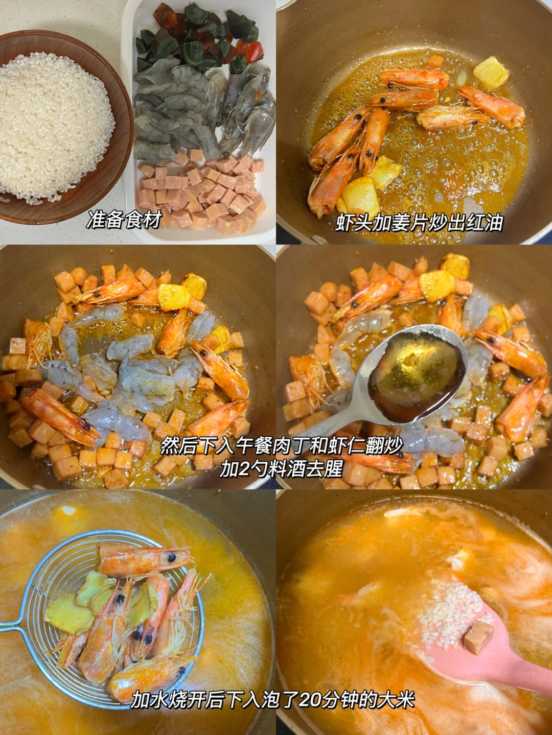 2️⃣爆香姜片下入虾头炒出红油,然后依次下入火腿和虾肉,炒到变色加2碗水,煮开后捞出虾头和姜片