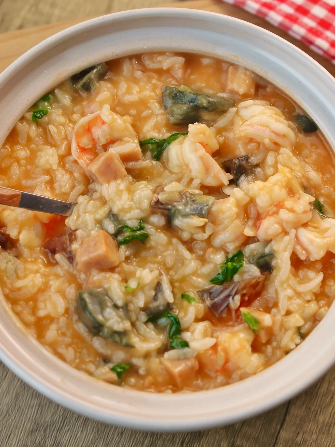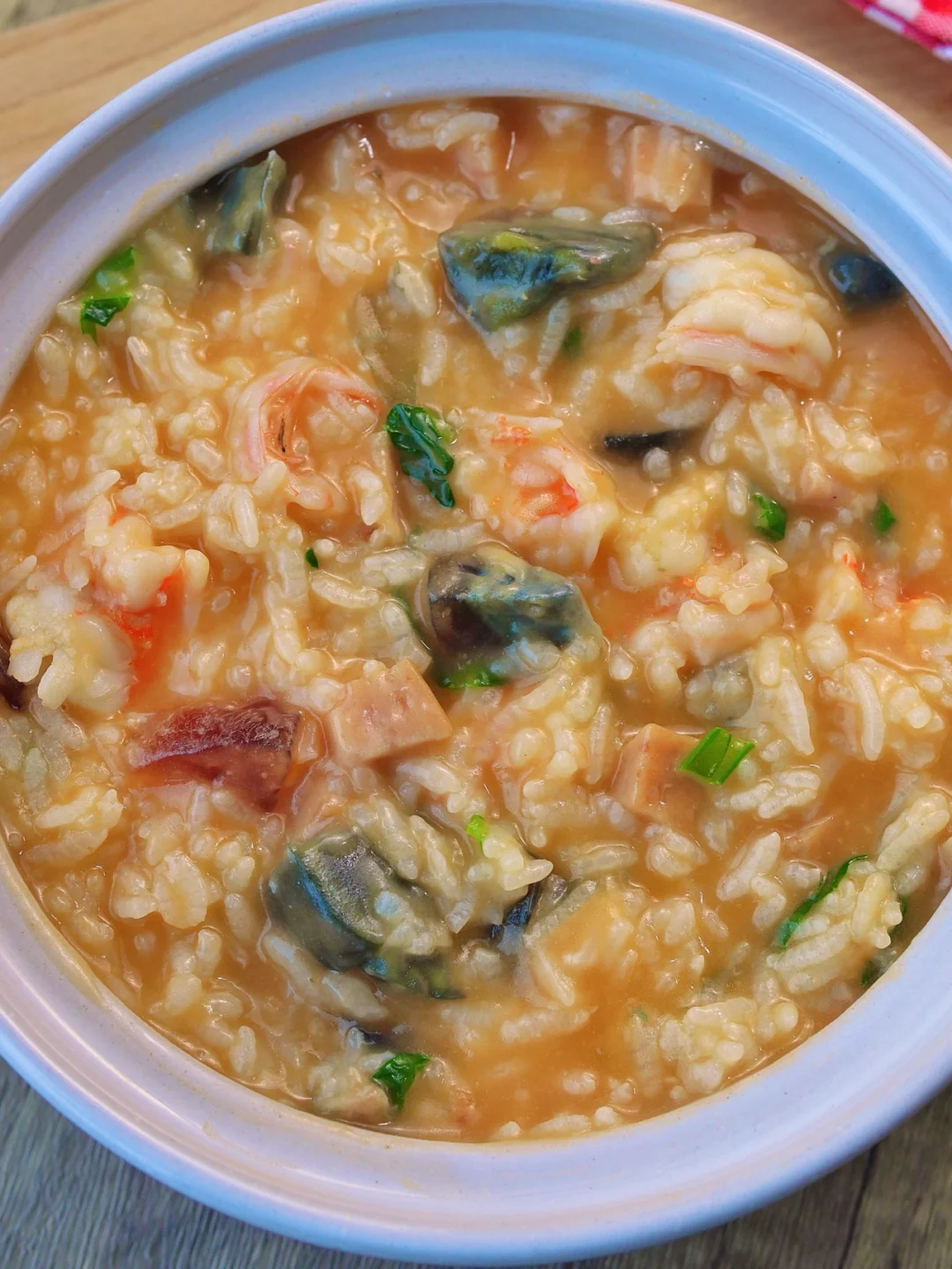皮蛋1个 大虾8个 火腿2片 大米 青菜(白菜 油菜 啥菜都行)