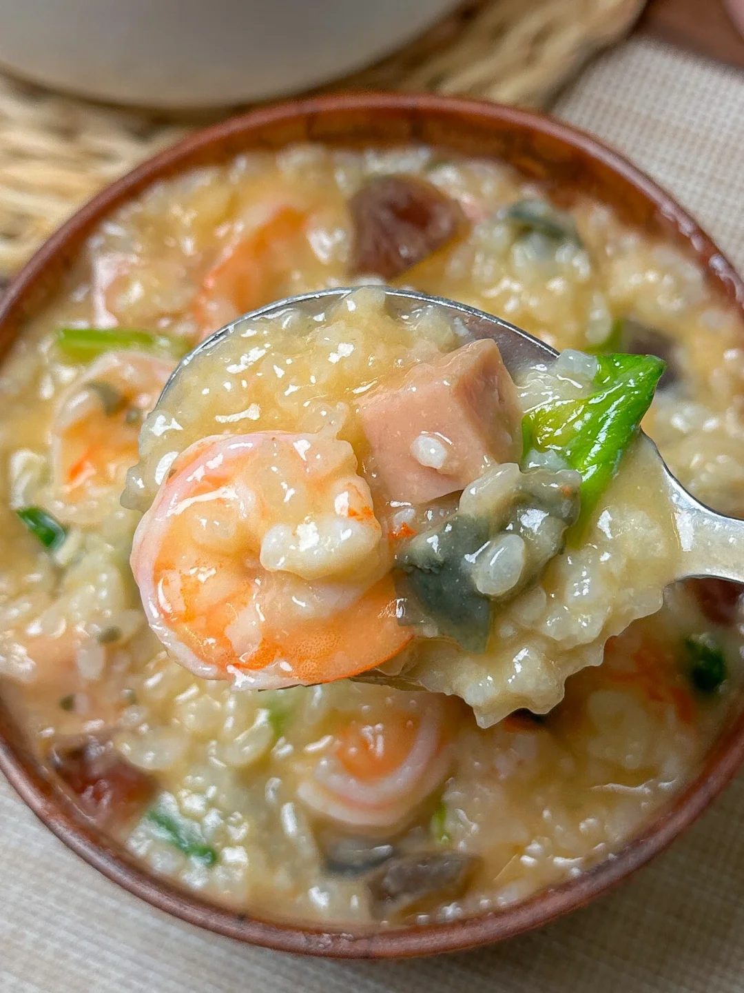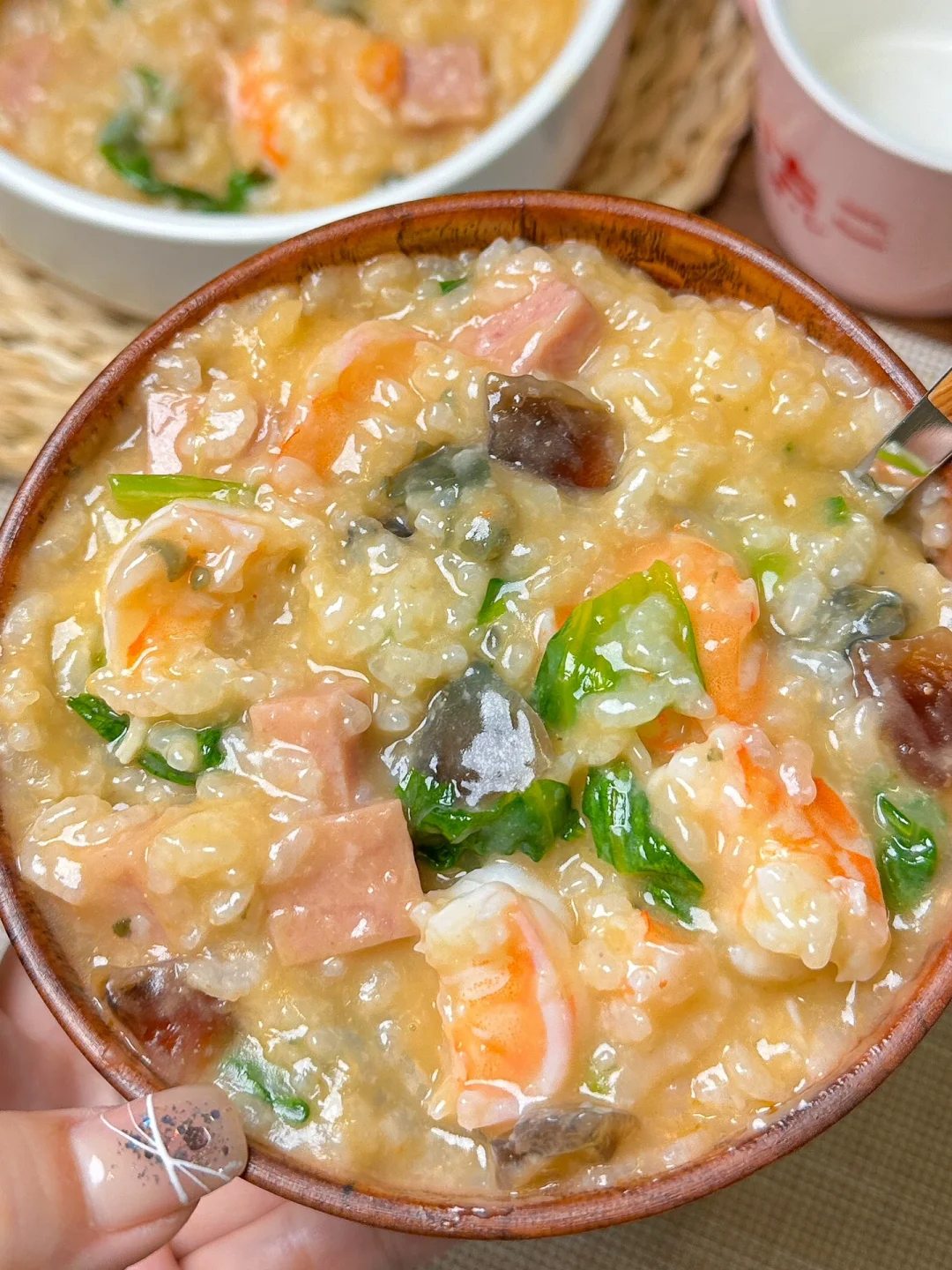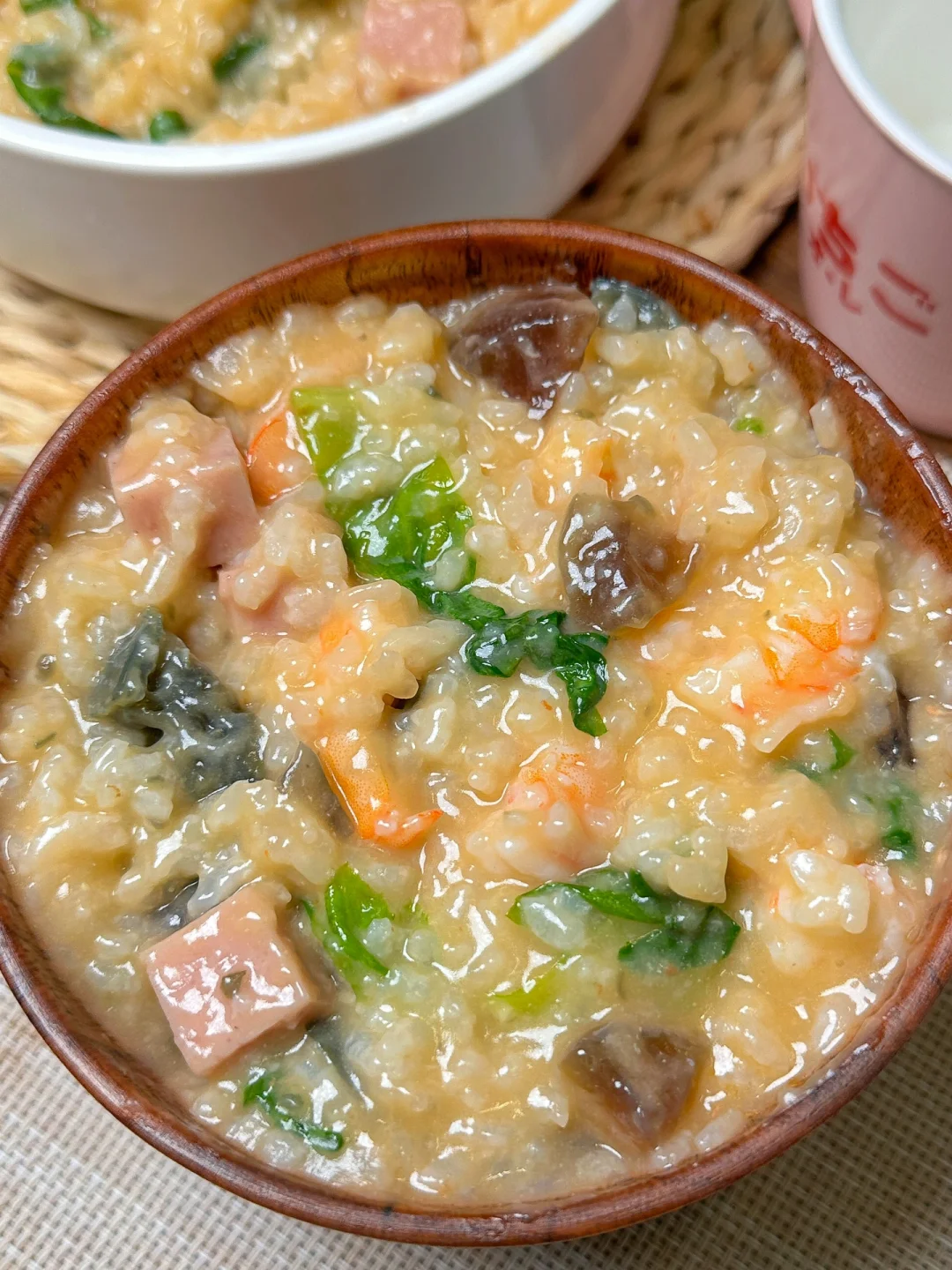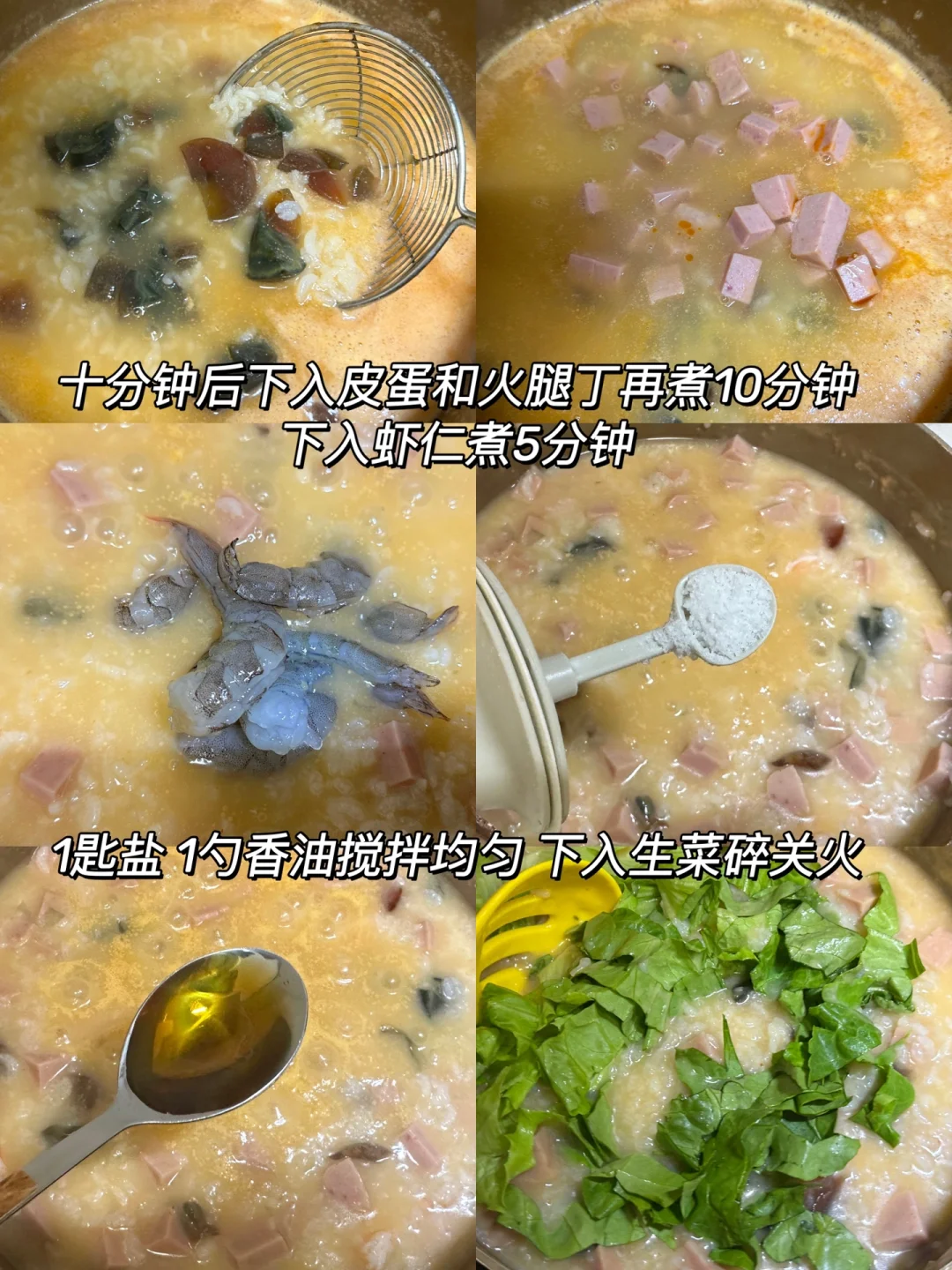 3️⃣午餐肉丁 皮蛋丁再煮10分钟,下虾仁煮5分钟,然后加1匙盐调味,最后再淋1勺香油关火加入生菜碎搅拌均匀就好啦
