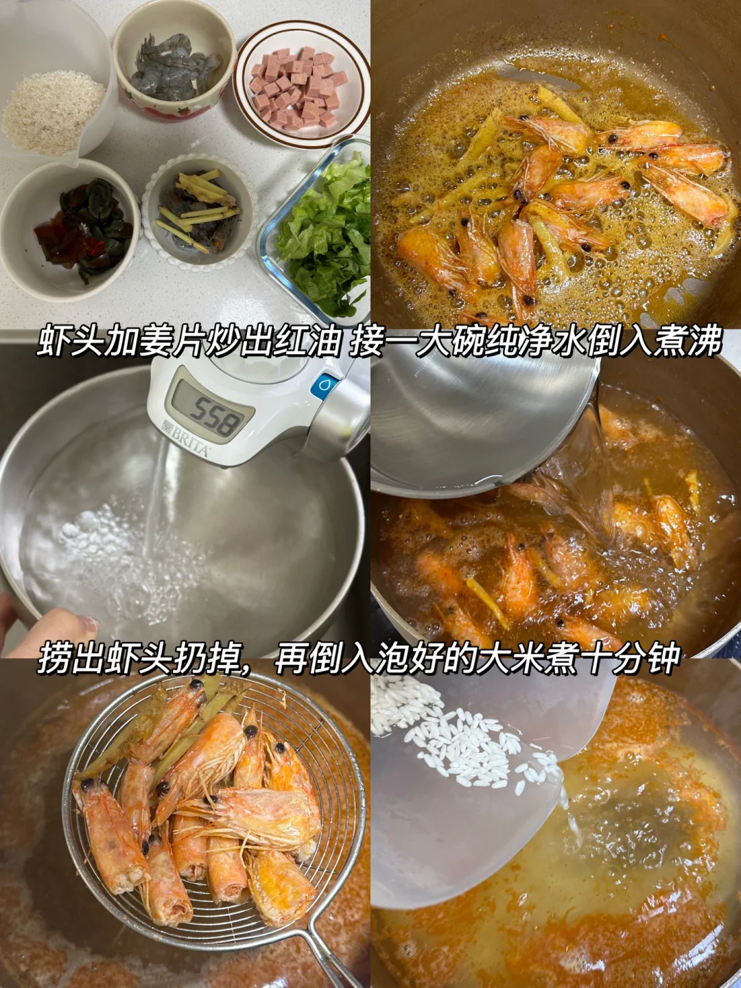 2️⃣热油下虾头和姜丝炒出红油然后加一锅纯净水煮开捞出虾头和姜丝,再倒入泡好的大米中小火煮10分钟
