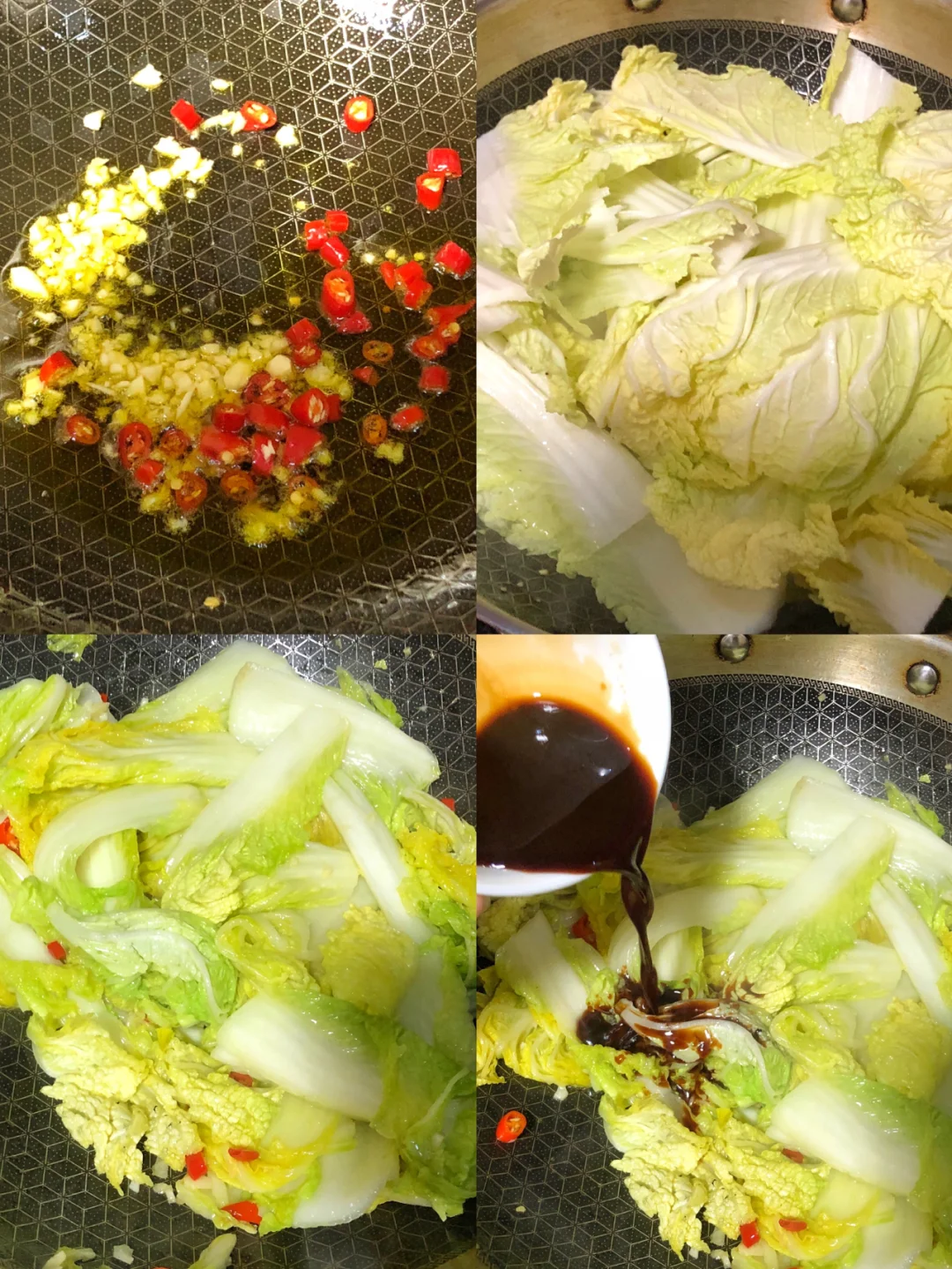 2️⃣锅里炒香蒜末小米辣,下入白菜炒软