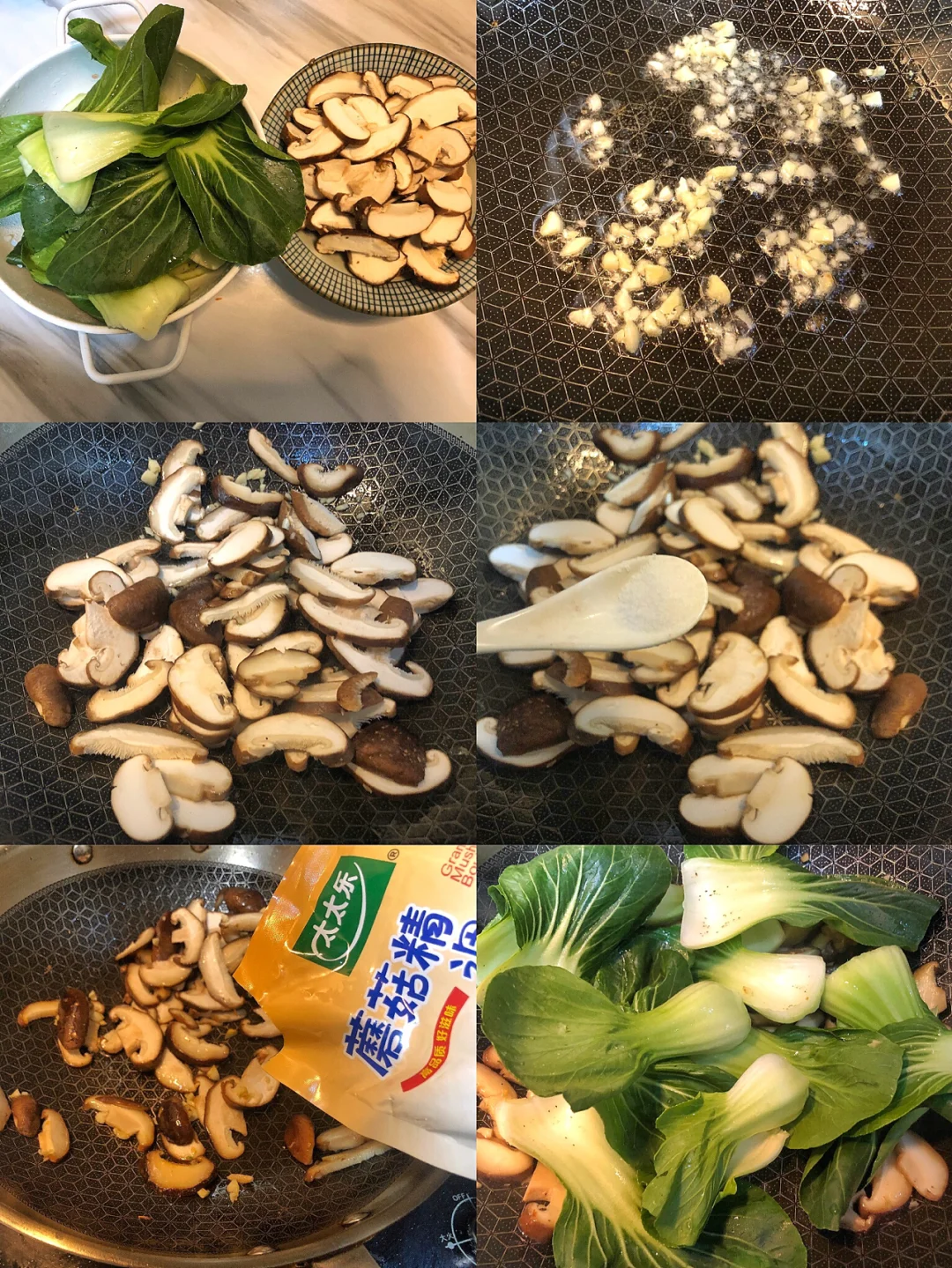 油菜炒香菇做法:香菇切片,蒜末爆香加入香菇炒软,加入1勺盐和1勺蘑菇精调味,最后加入油菜(这个菜真的很解馋,香菇真的很好吃,总觉得有肉的味道,加些蘑菇精味道会更鲜美~)