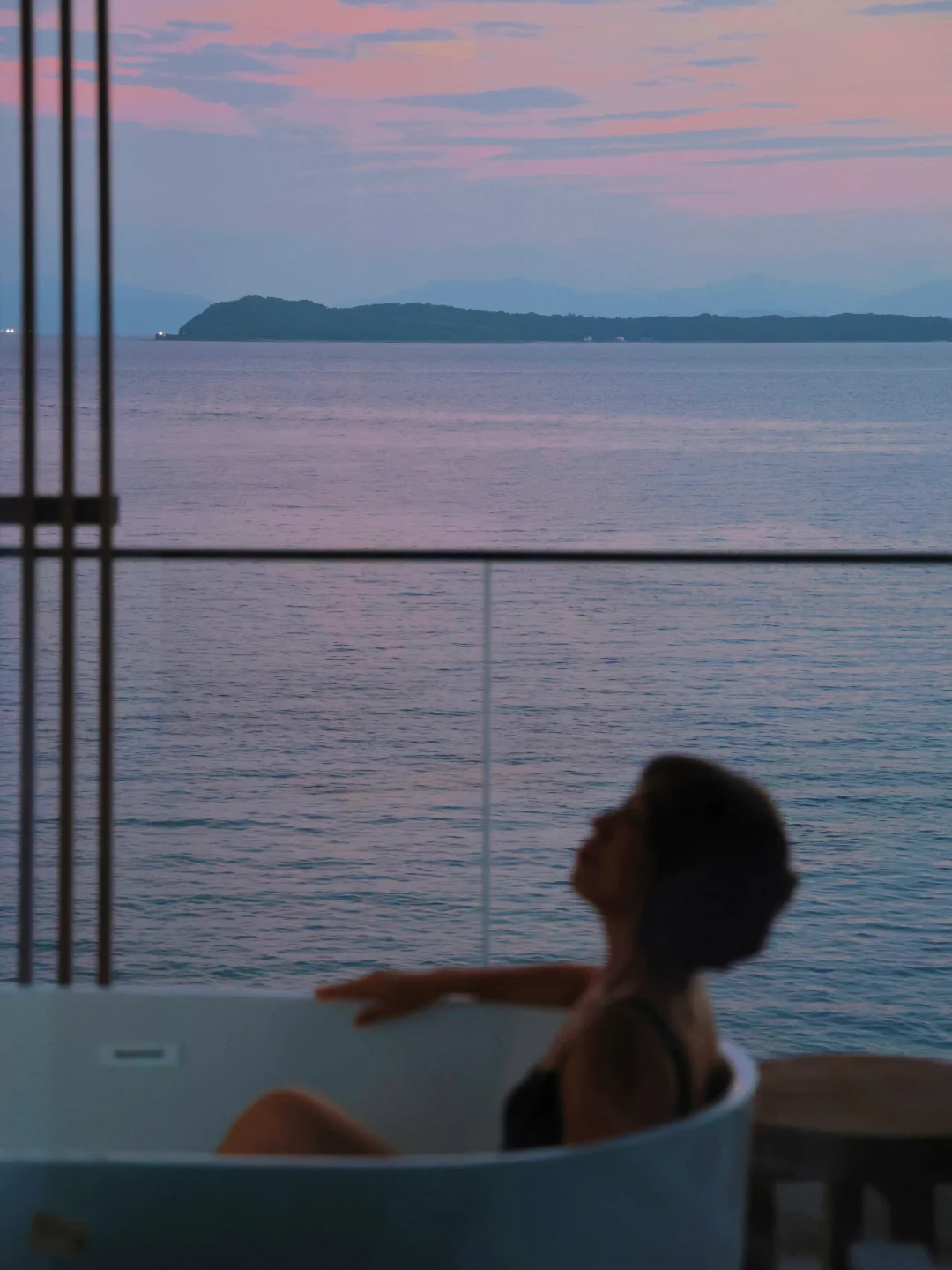 半山半海,侘寂风房间拥有全海景落地窗,躺进海平面,推门就是玻璃海,浴缸对海太浪漫~日落时分推荐在房间或楼下感受橘子海配晚风的浪漫