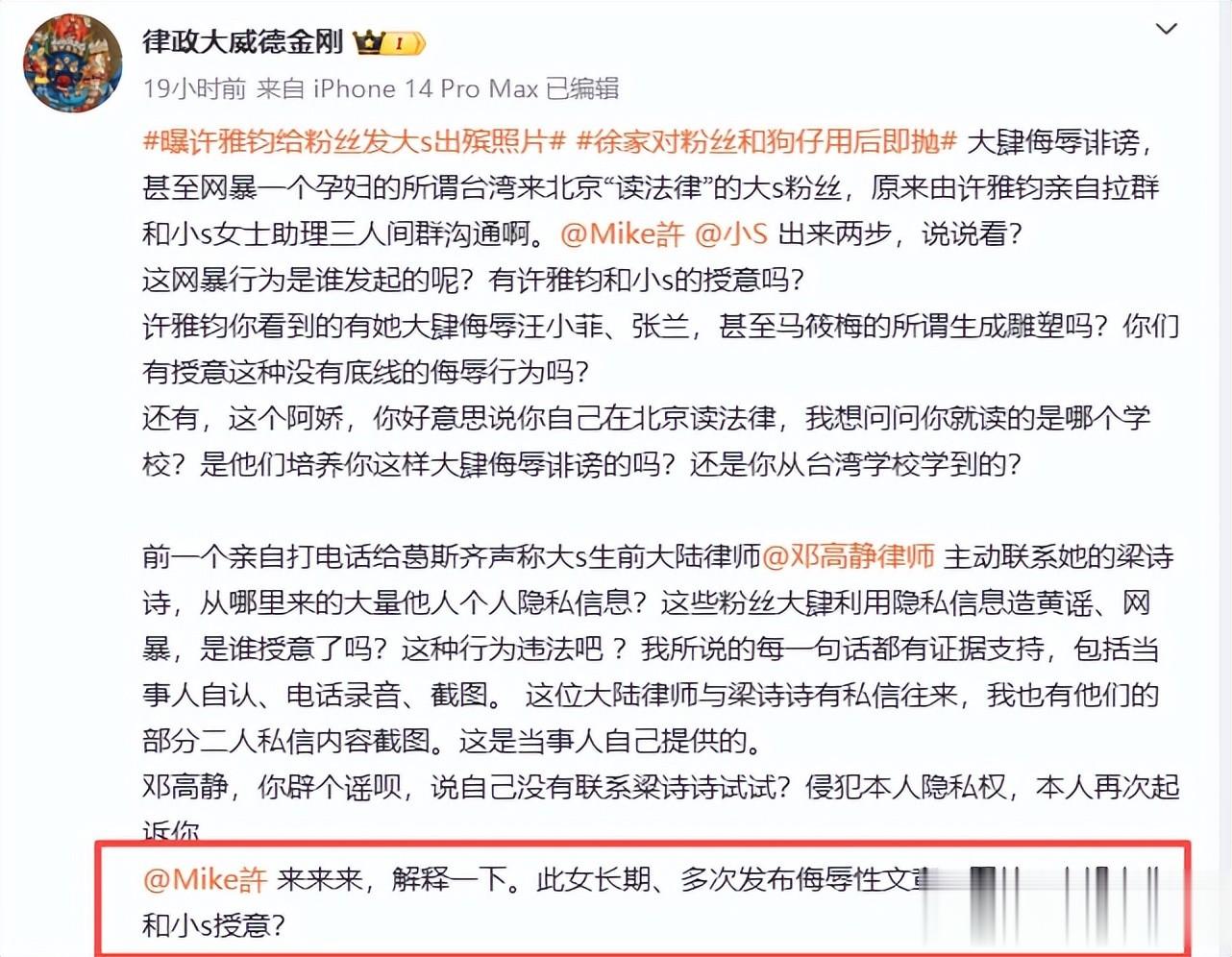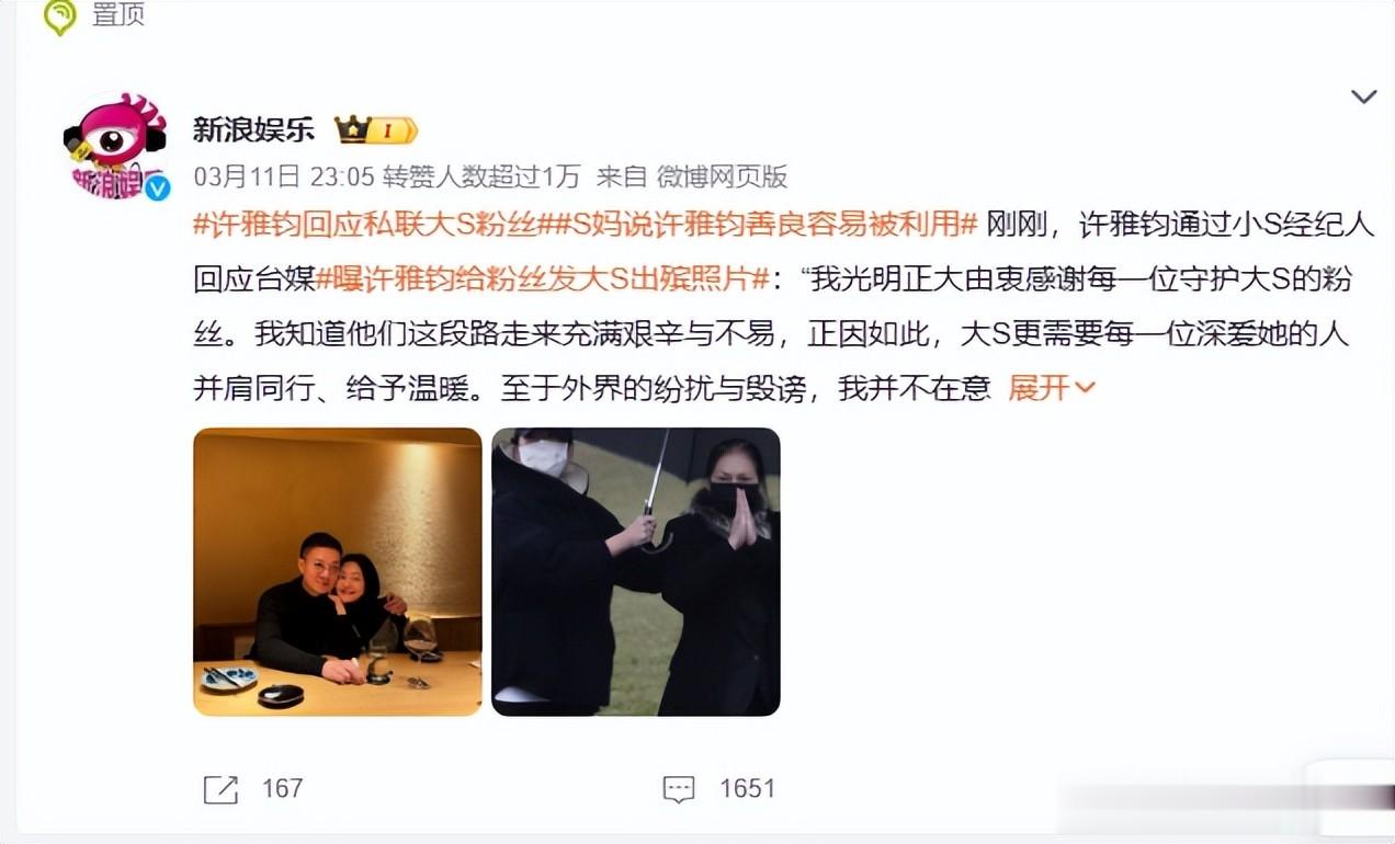 就在网络上对许雅钧和小S发文声讨,意指着粉丝的抹黑行为是有组织预谋的,而背后的组织者就是徐家人。