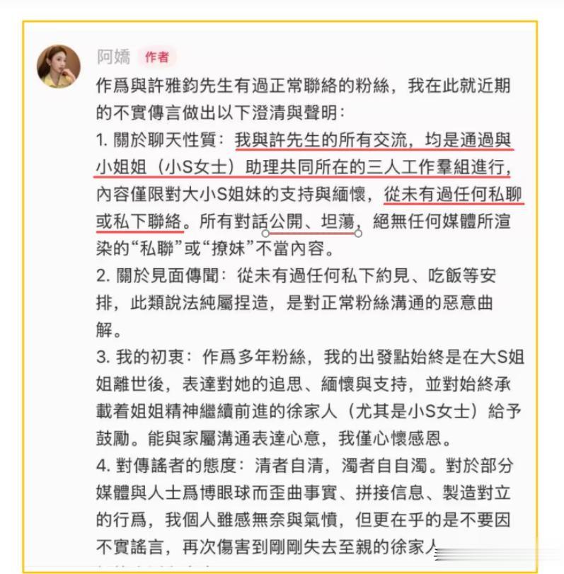 这个女粉丝直接就跳出来称自己并没有和许雅钧私下聚会,还称他们的交流一直都是在群里进行的,就连小S的助理都在那个群聊里面。