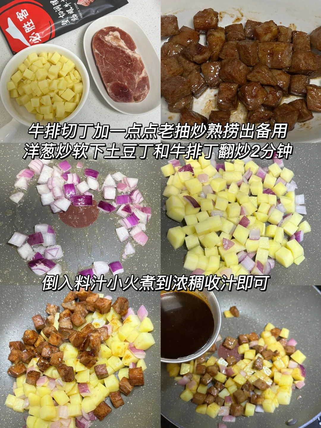 2️⃣牛排切丁加一点点老抽炒熟捞出备用洋葱炒软下土豆丁和牛排丁翻炒2分钟
