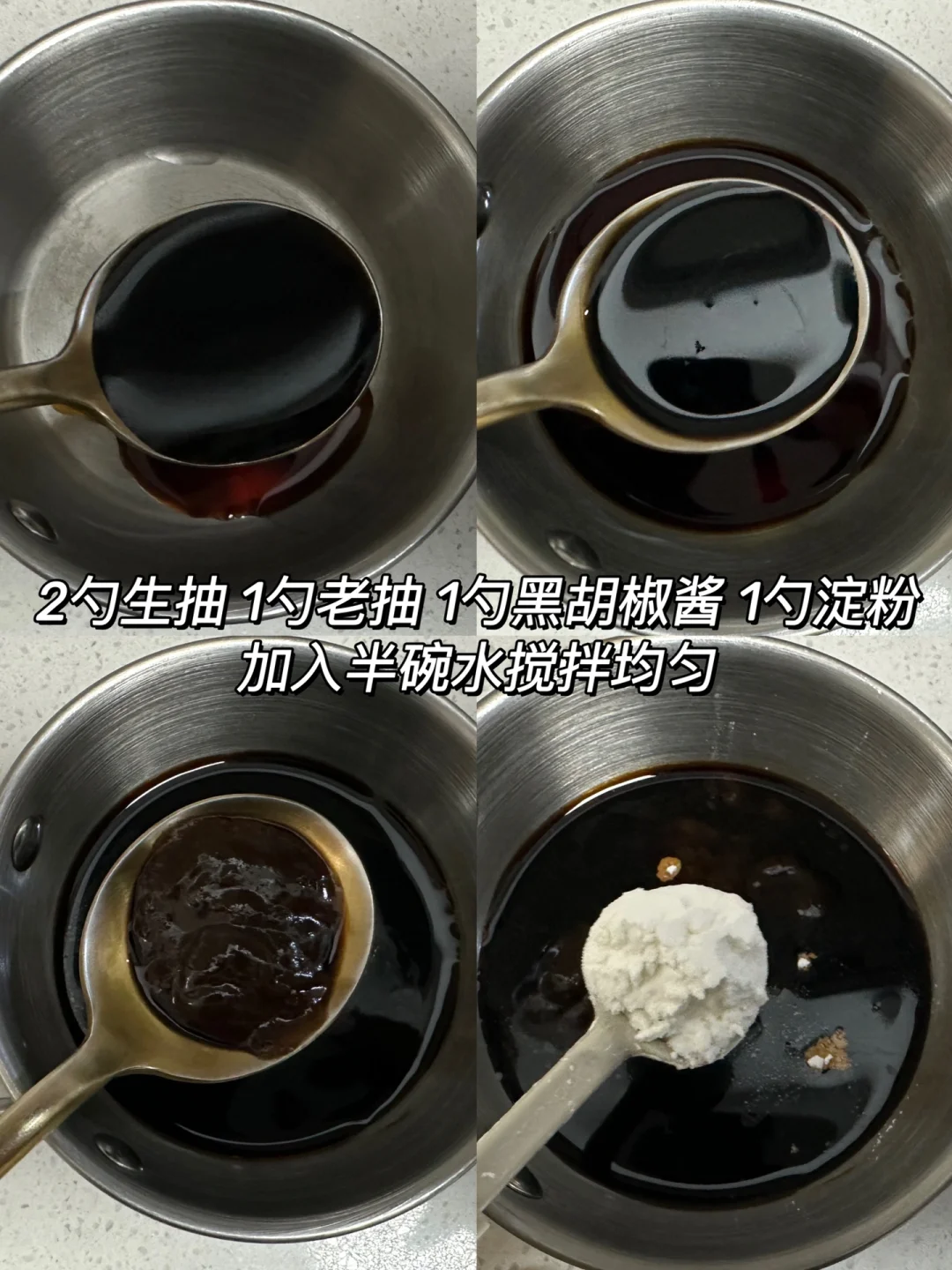 1️⃣调一个碗汁:2勺生抽 1勺老抽 1勺黑胡椒酱 1勺淀粉,加入半碗水搅拌均匀