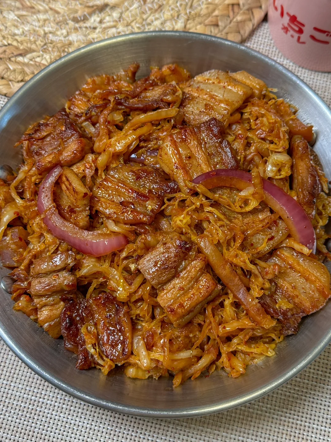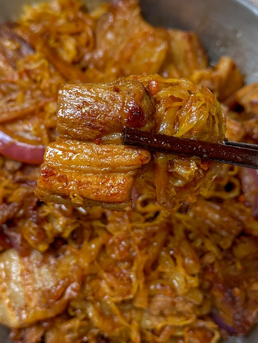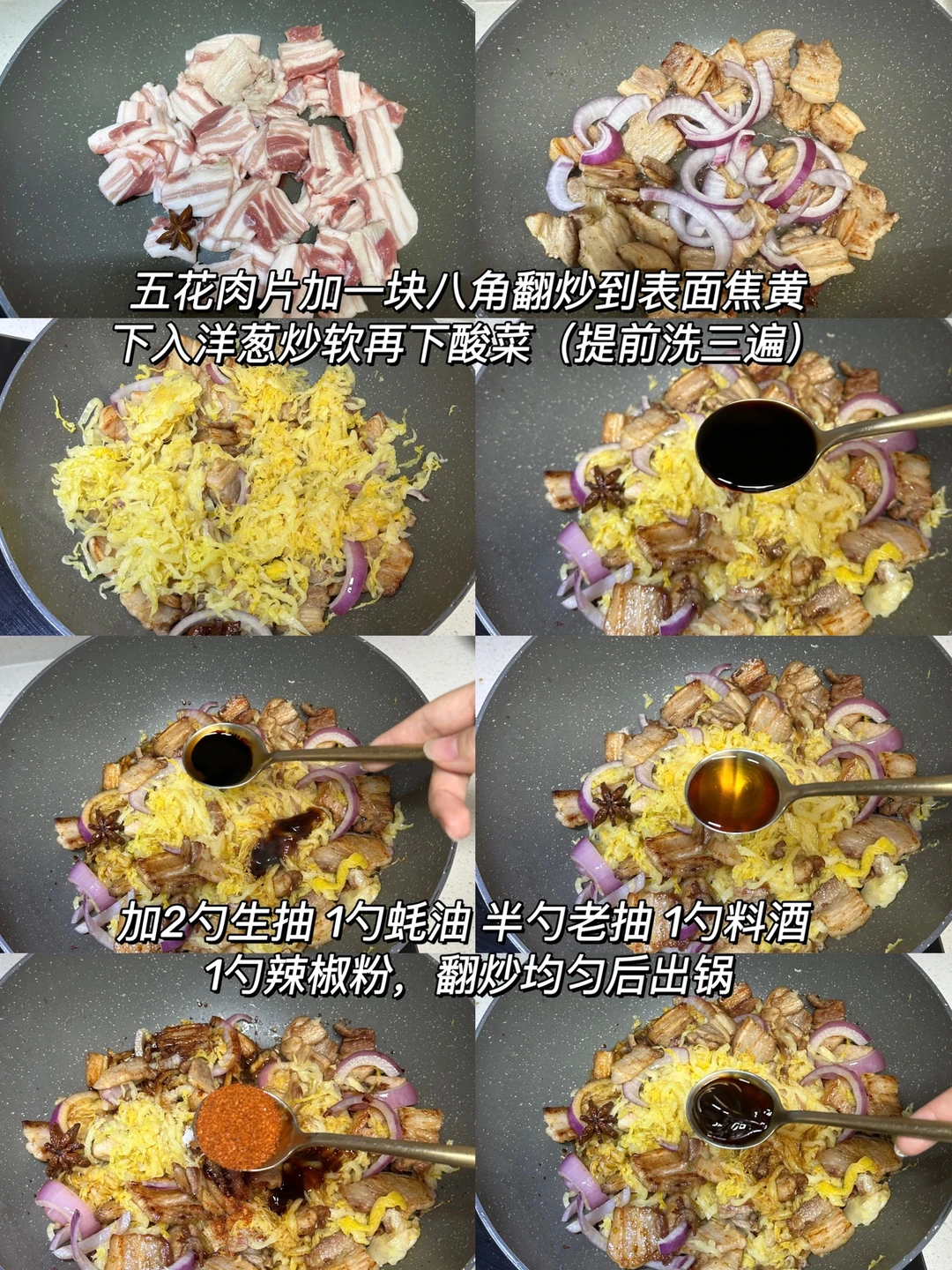 1️⃣五花肉片加一块八角翻炒到表面焦黄,下入洋葱炒软再下酸菜(酸菜提前洗三遍)