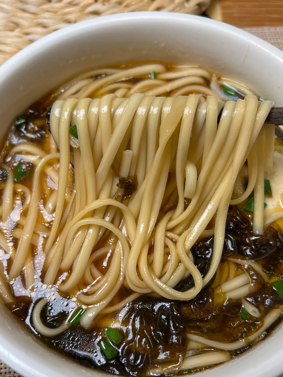 2️⃣碗底加入紫菜 虾皮 香油 2勺生抽 葱花,连面带汤倒入碗里,放入荷包蛋就好啦~