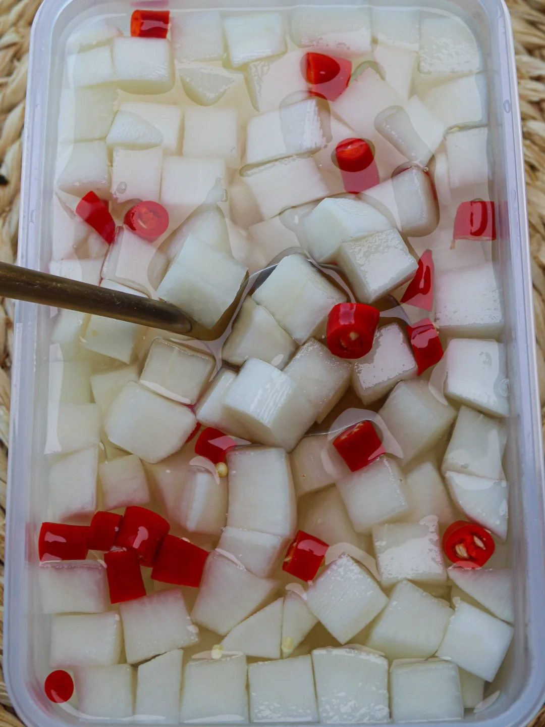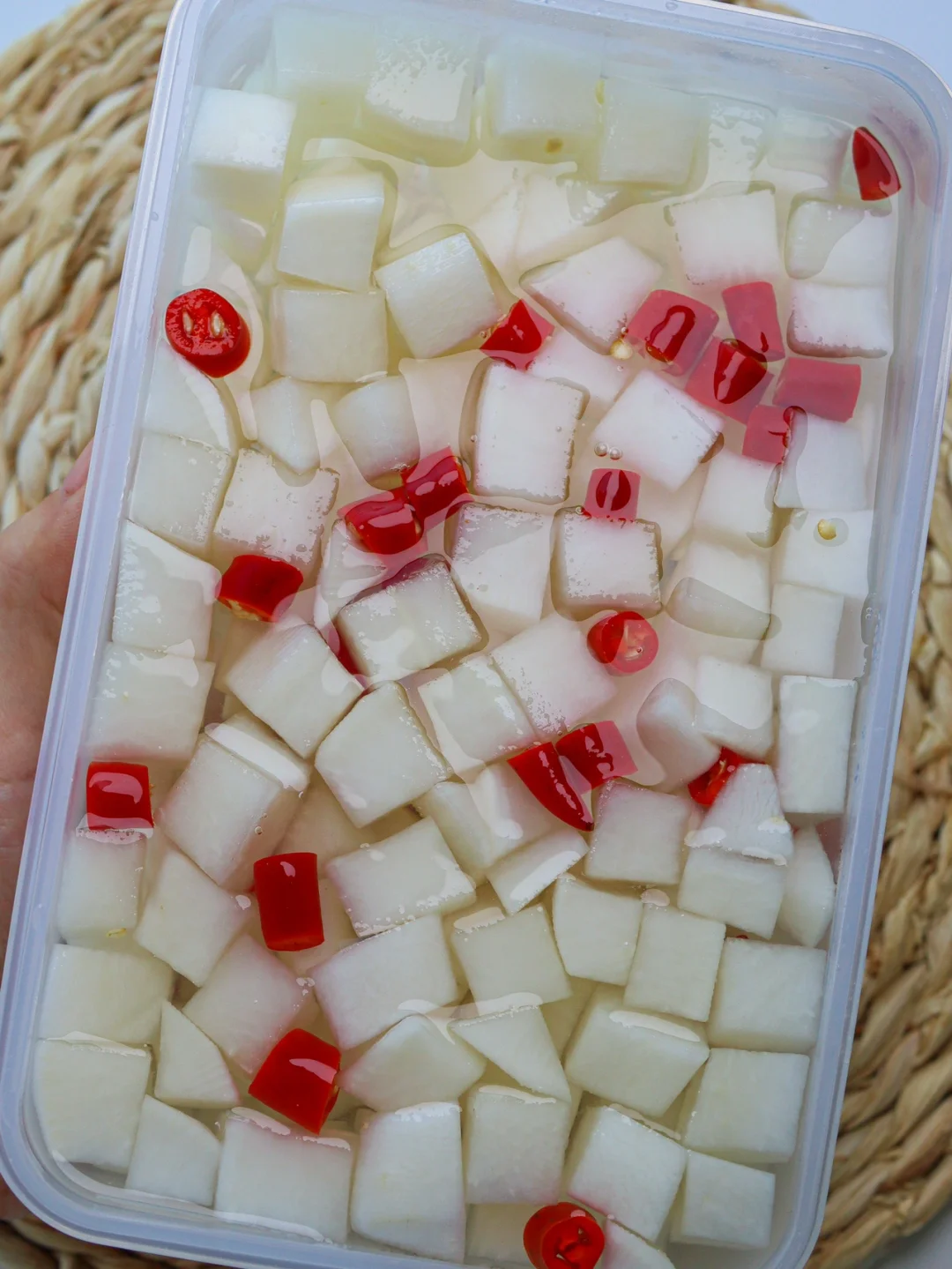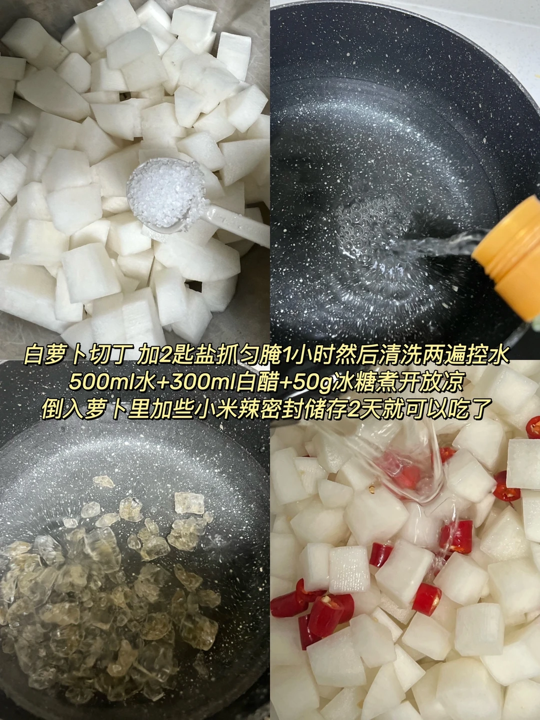 2️⃣500ml水加入300ml白醋和50g冰糖煮开放凉倒入罗卜里再加些小米辣密封冷藏2天就可以吃啦~