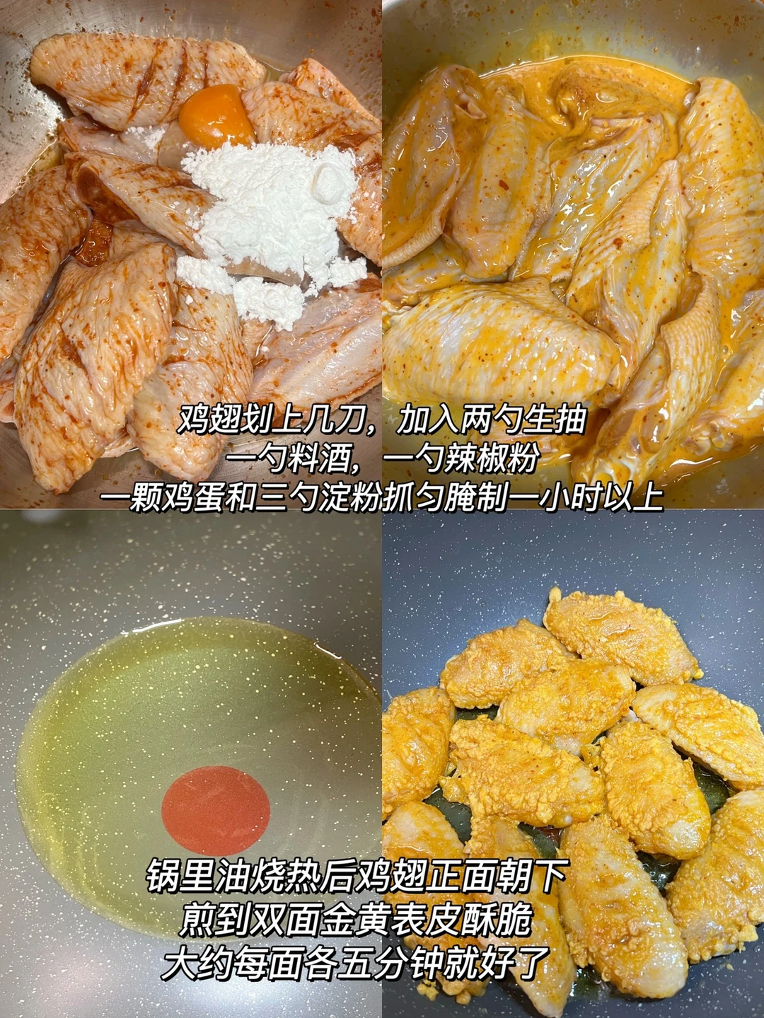 1️⃣鸡翅表面划伤口,加2勺生抽 1勺料酒 1勺耗油 1勺辣椒粉 一颗鸡蛋 和3大勺面粉抓匀腌制1小时以上