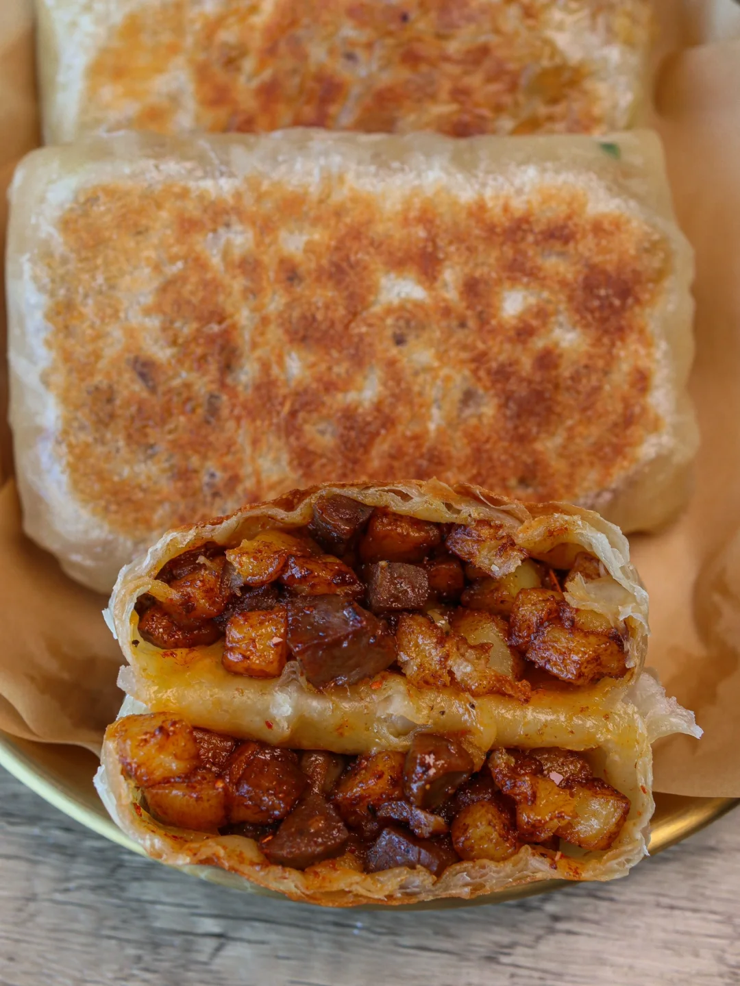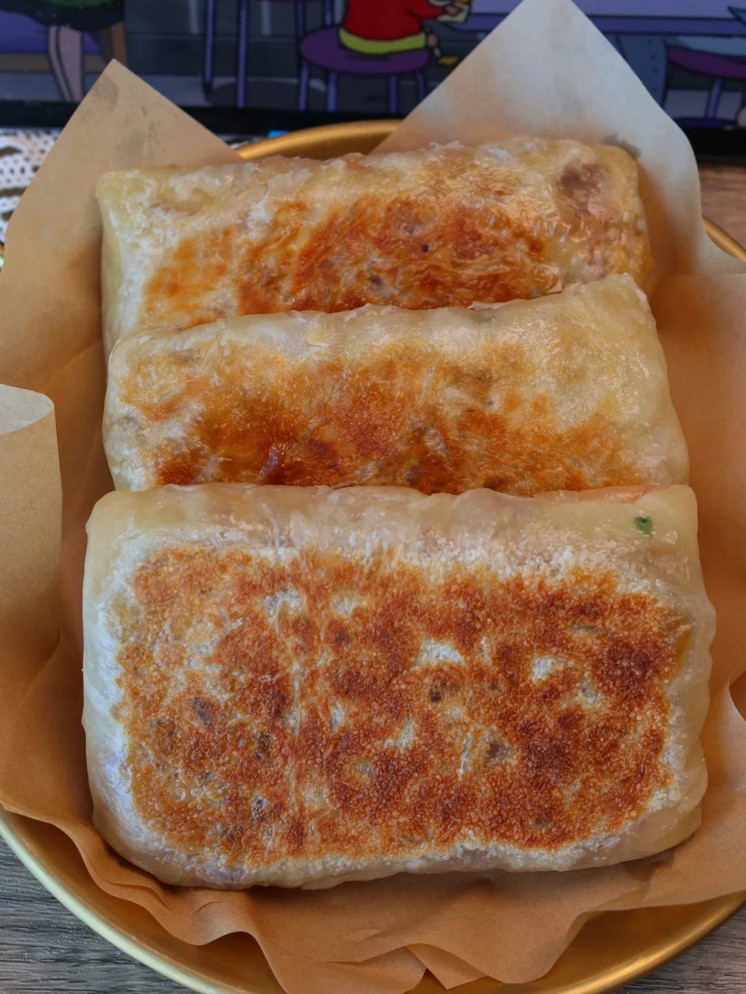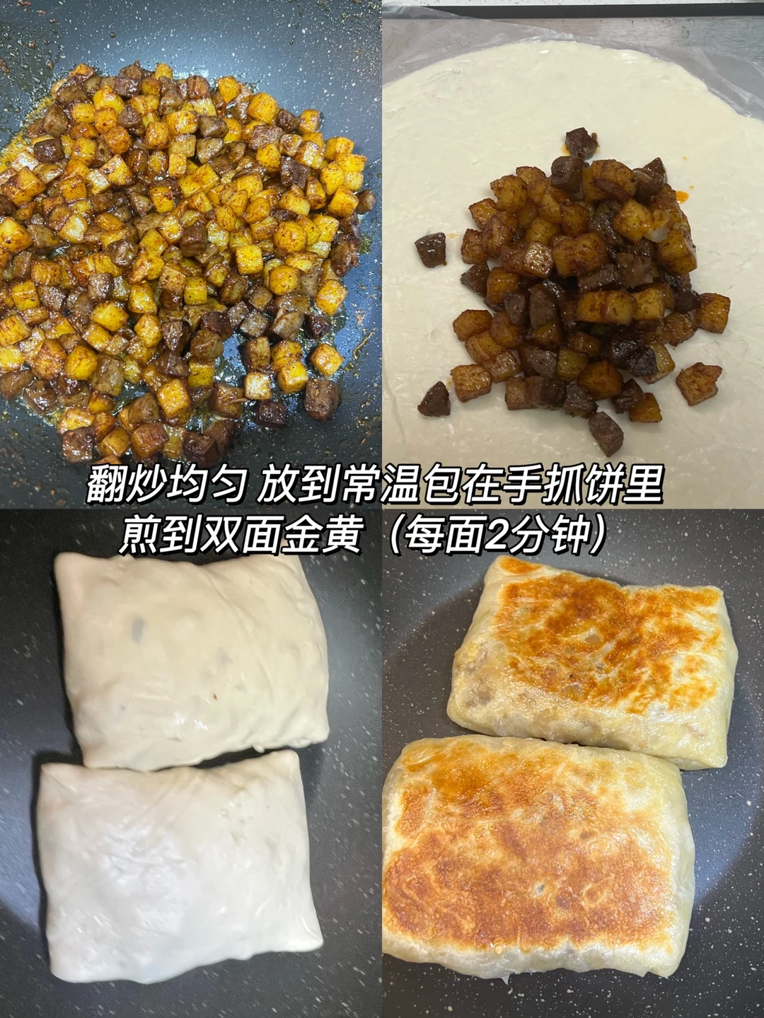2️⃣手抓饼解冻后把馅料包起来煎到双面焦黄就可以啦~