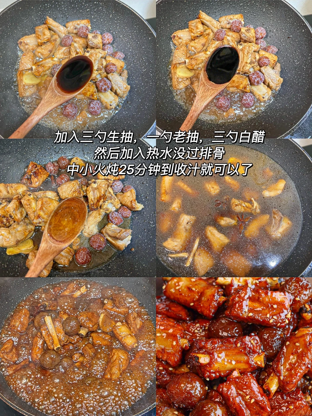3️⃣3勺生抽 1勺老抽 3勺白醋调味,倒入热水没过排骨,盖盖子中小火炖25~30分钟收汁即可~