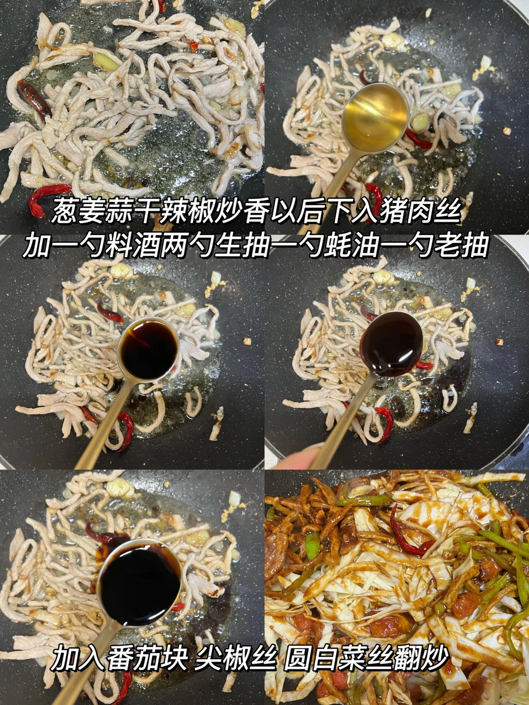 1️⃣葱姜蒜 干辣椒 花椒炒香然后加肉翻炒变色,加入料酒 生抽 蚝油 老抽调味,然后下入蔬菜