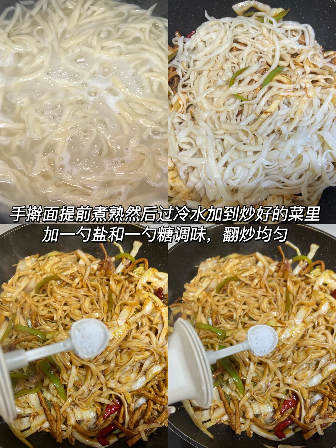 2️⃣面条提前煮熟过冷水,再加到锅里继续翻炒,加1匙盐和1匙白糖调味,翻炒均匀就好啦