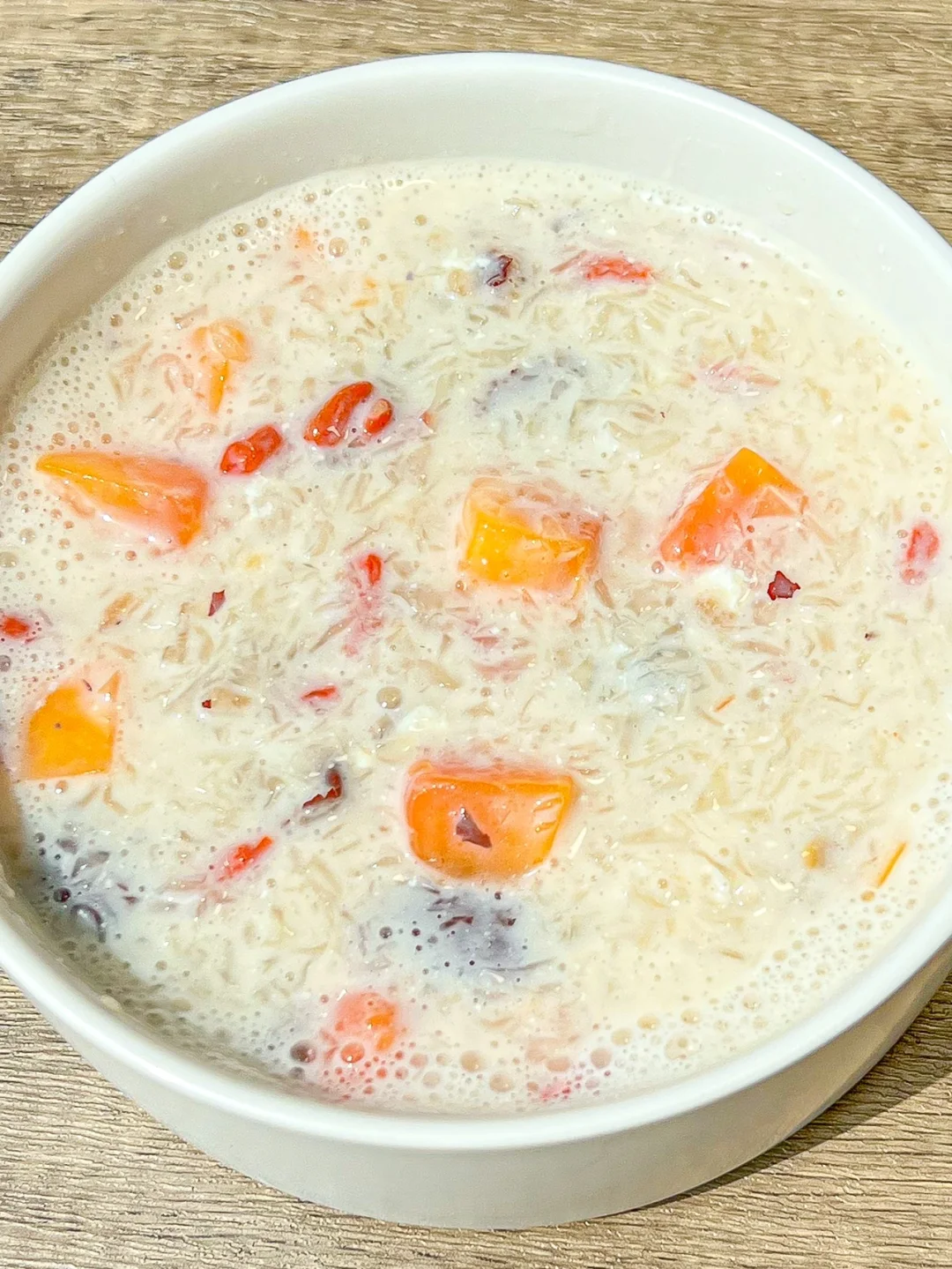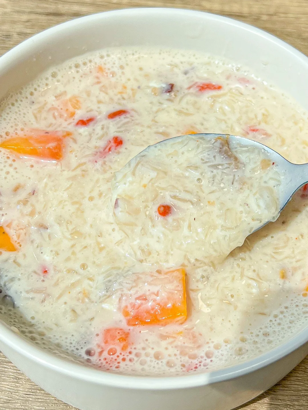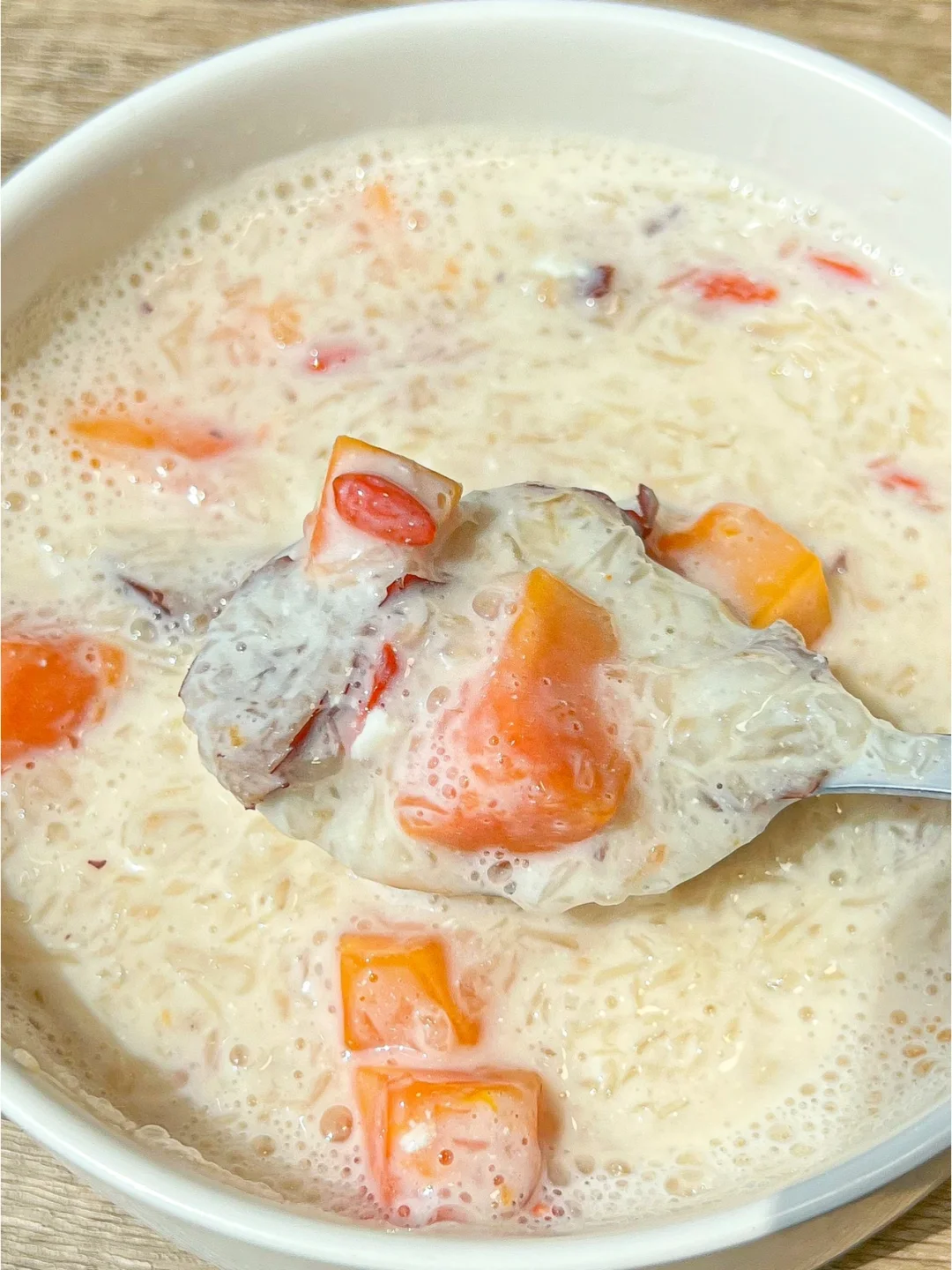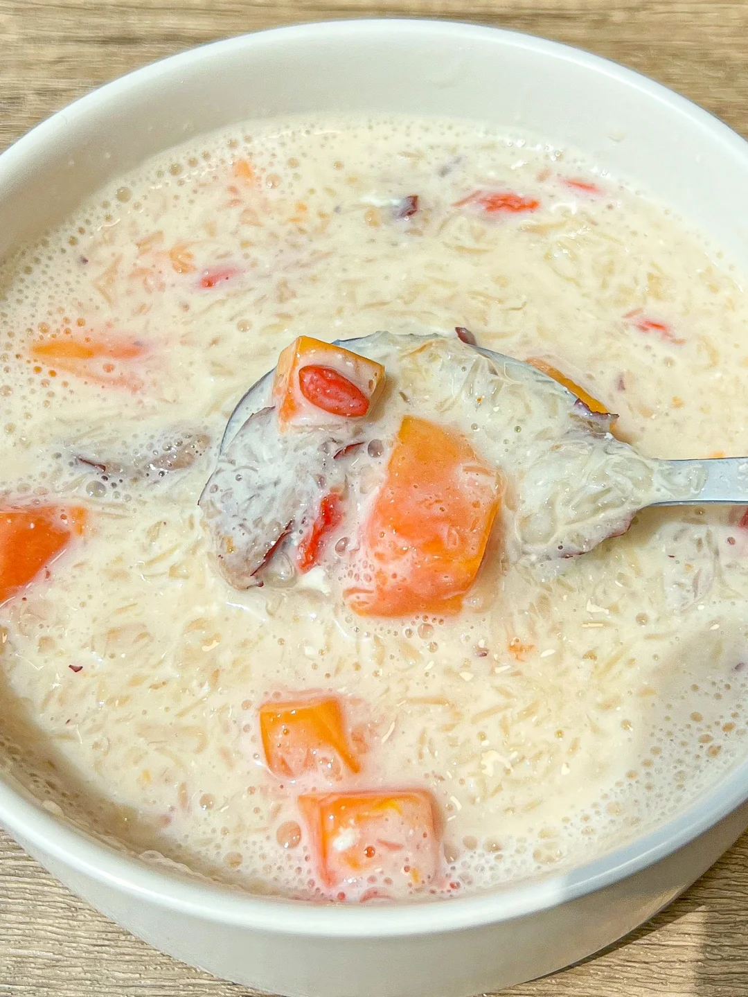 我妈整来了这个椰汁木瓜银耳羹的方子,回来就煮了一大锅!我们俩都喝光光了~