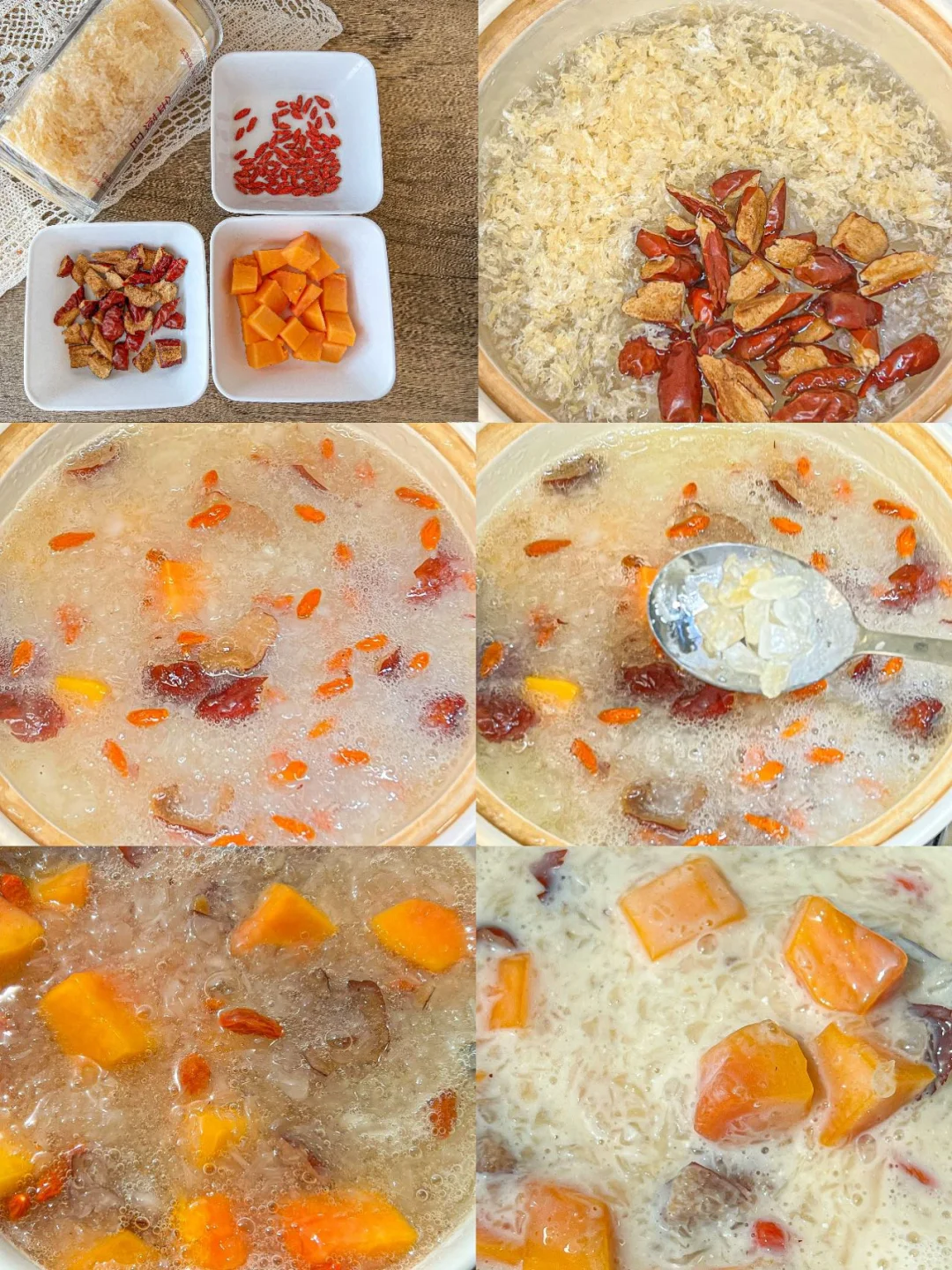 银耳和红枣冷水入锅煮10分钟,加入枸杞和木瓜再煮2分钟,然后出锅加入椰汁搅合搅合就好啦