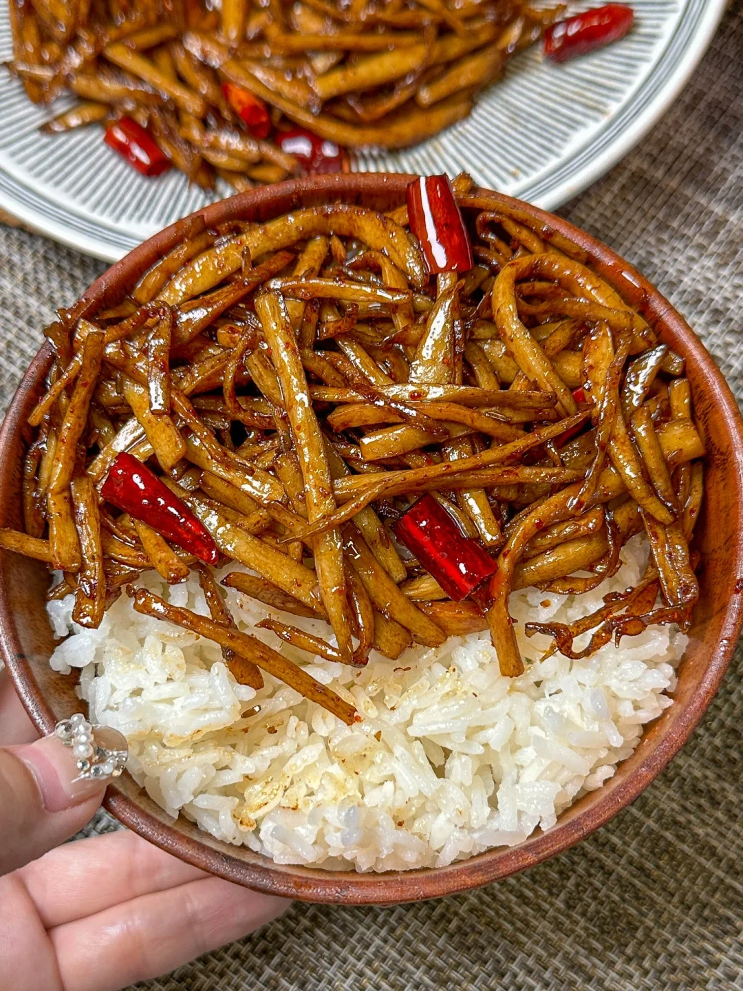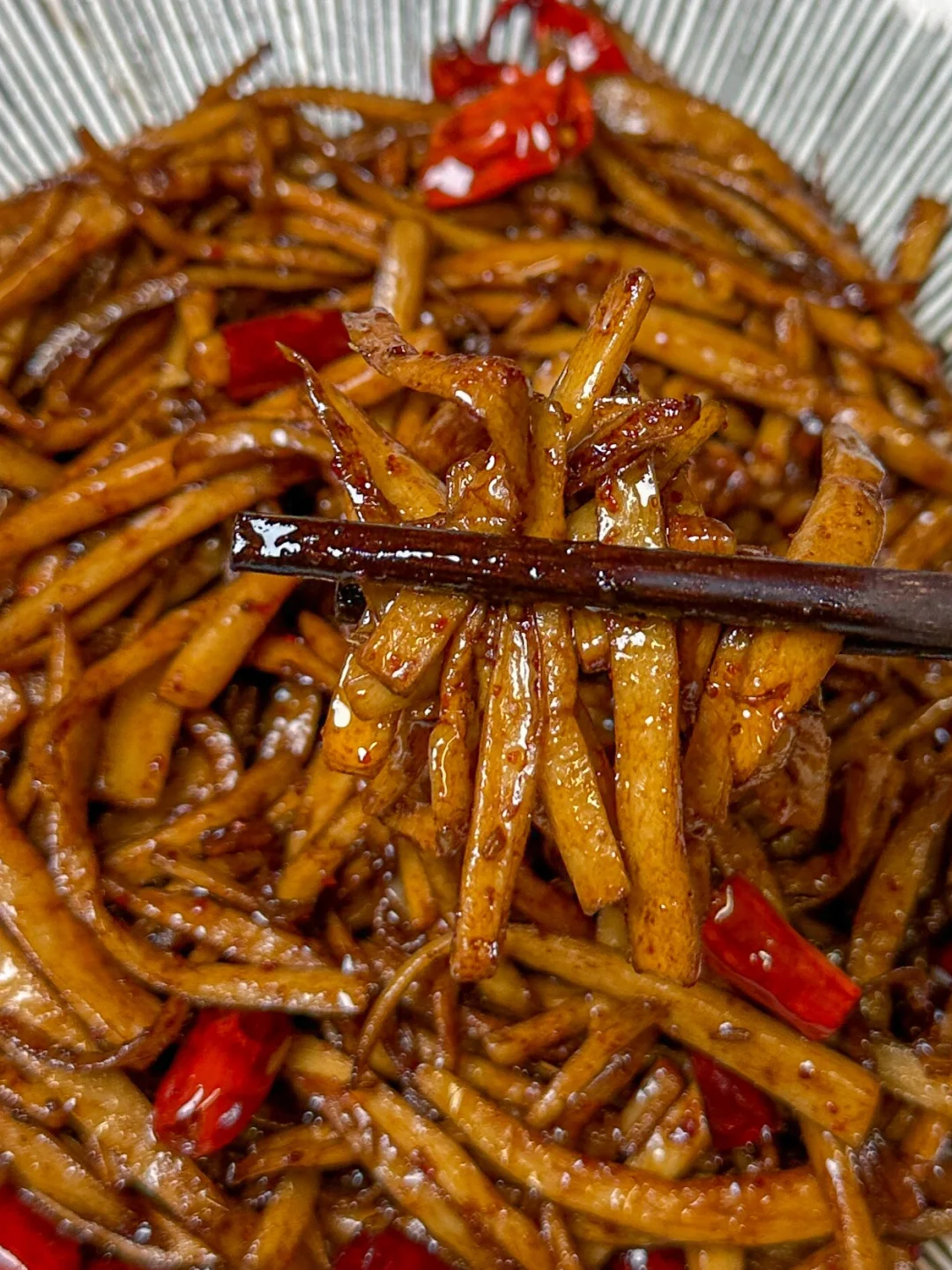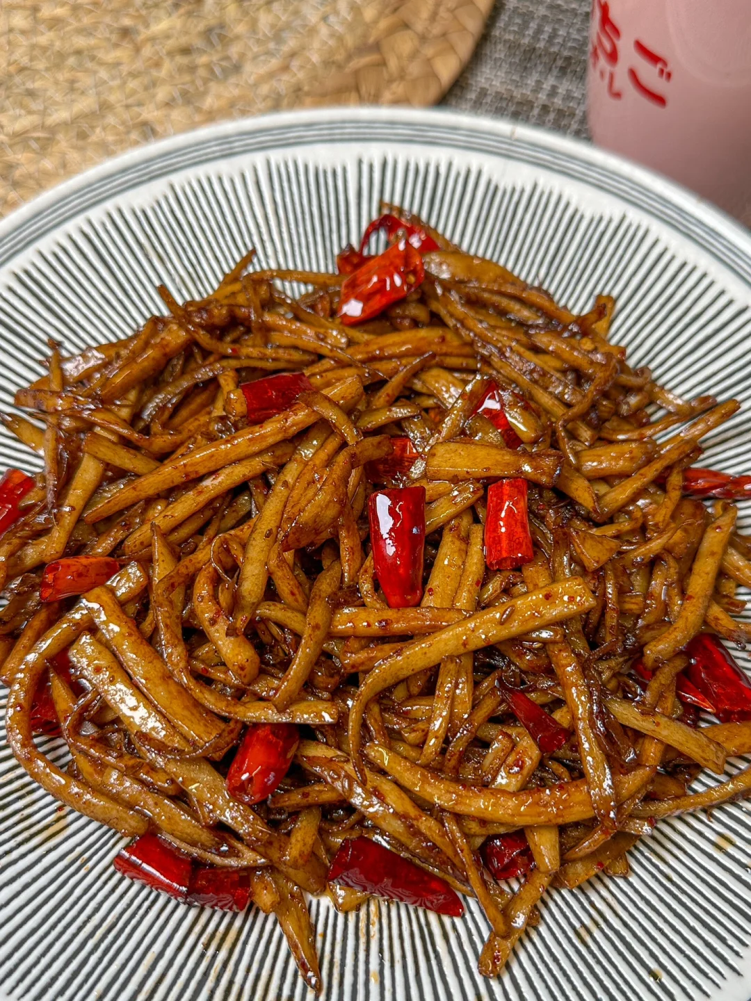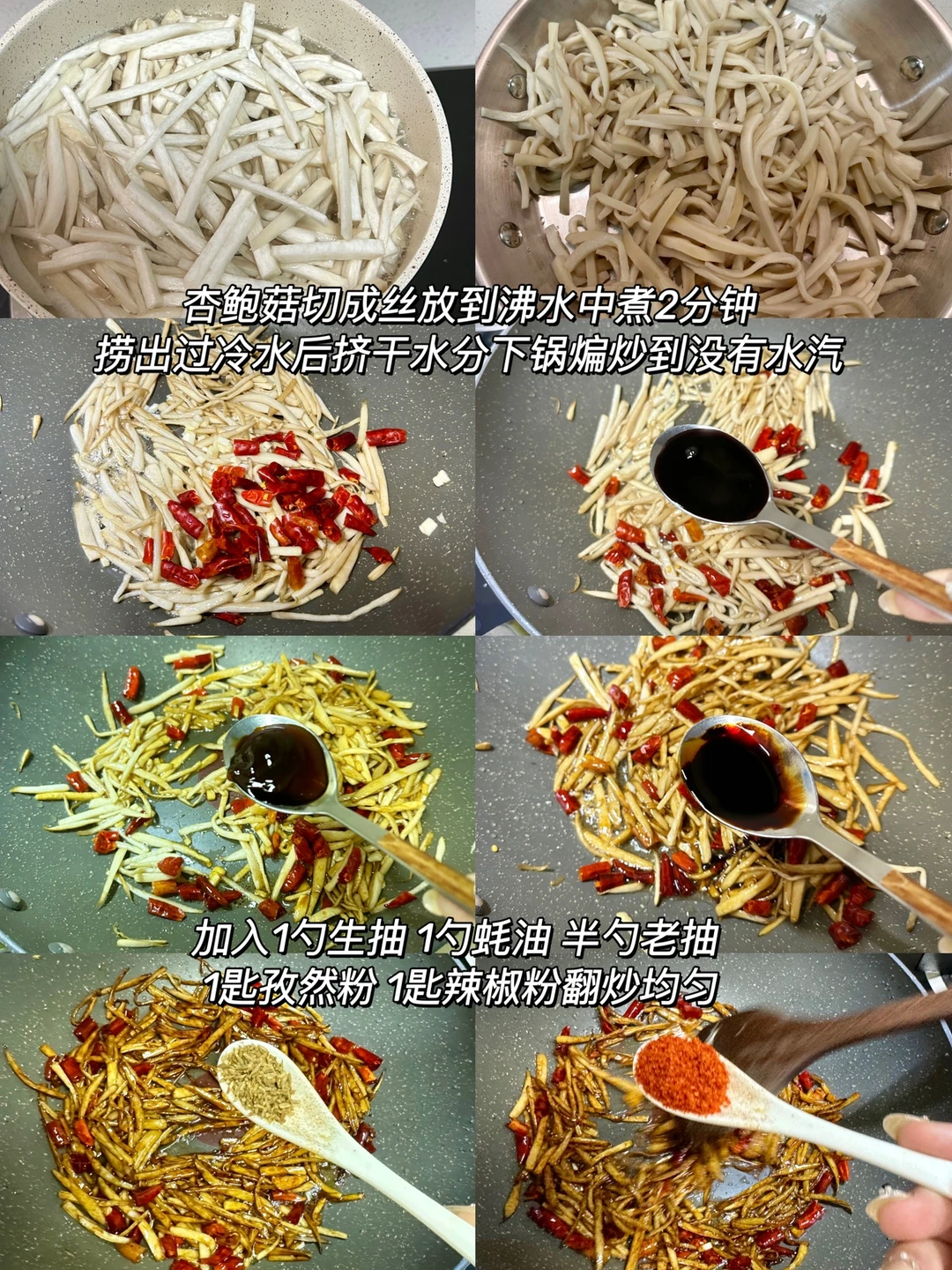 1️⃣ 杏鲍菇切成丝放到沸水中煮2分钟,捞出过冷水后挤干水分下锅煸炒到没有水汽