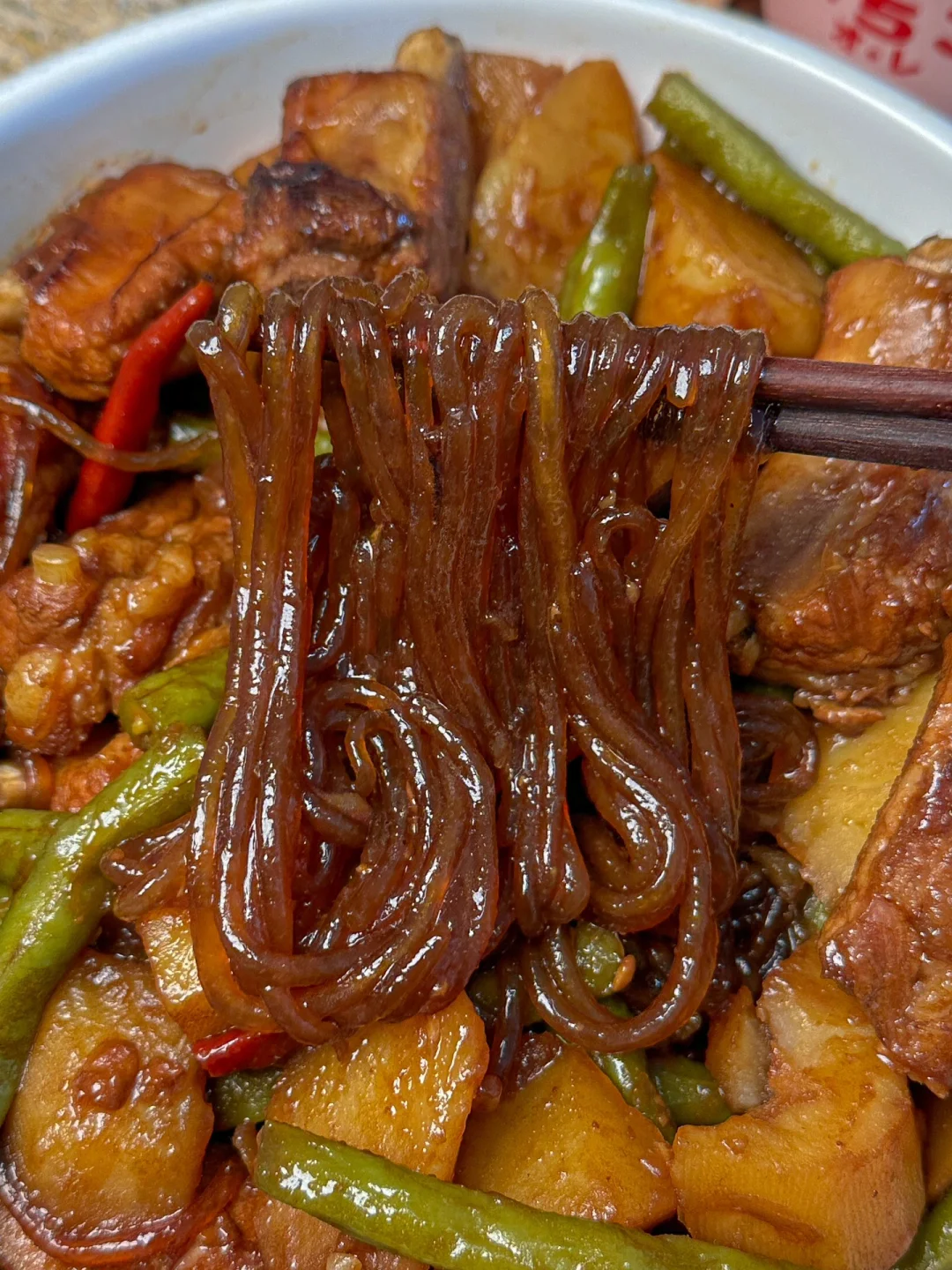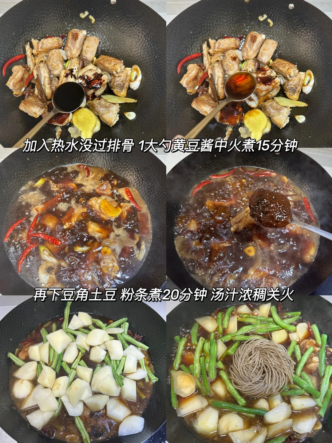 3️⃣再下豆角 土豆和粉条煮20分钟,汤汁浓稠关火