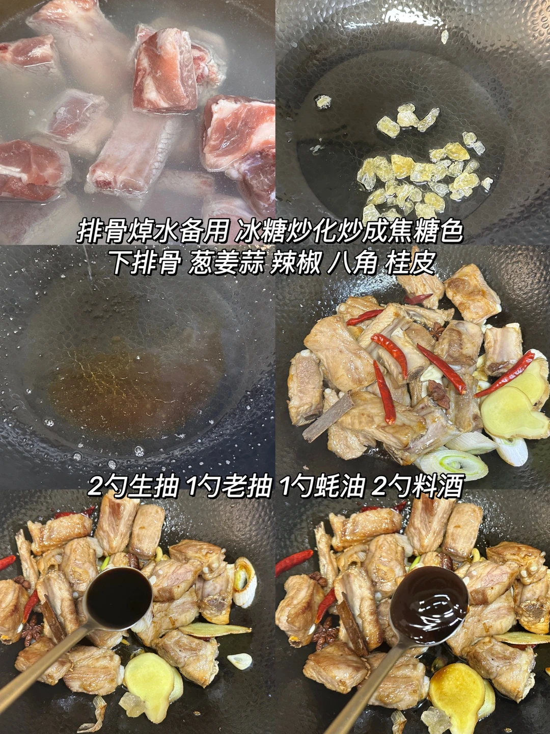1️⃣ 排骨焯水备用,冰糖炒化炒成焦糖色,下排骨、葱姜蒜、辣椒 八角 桂皮
