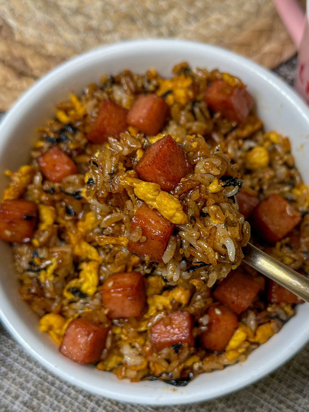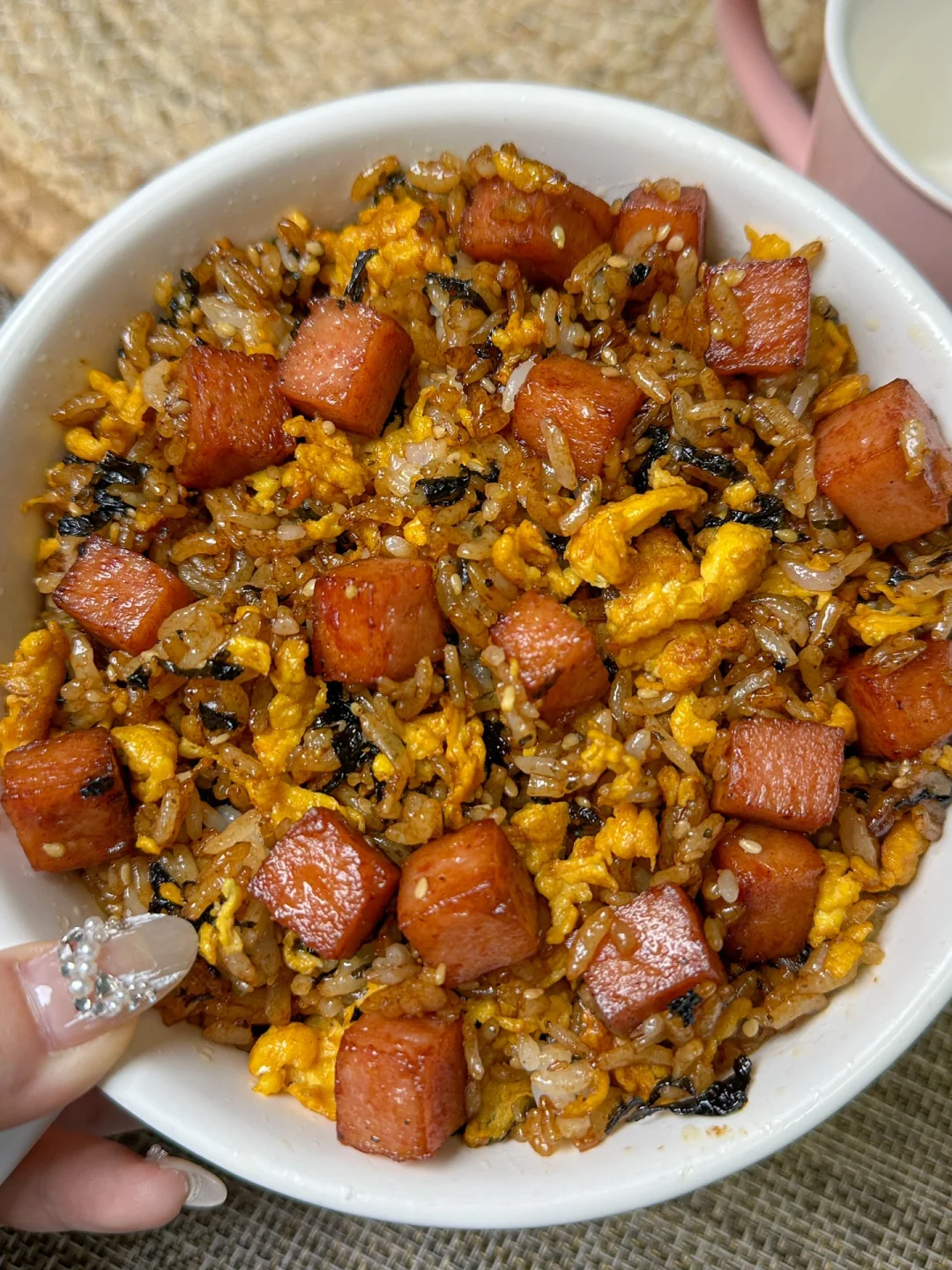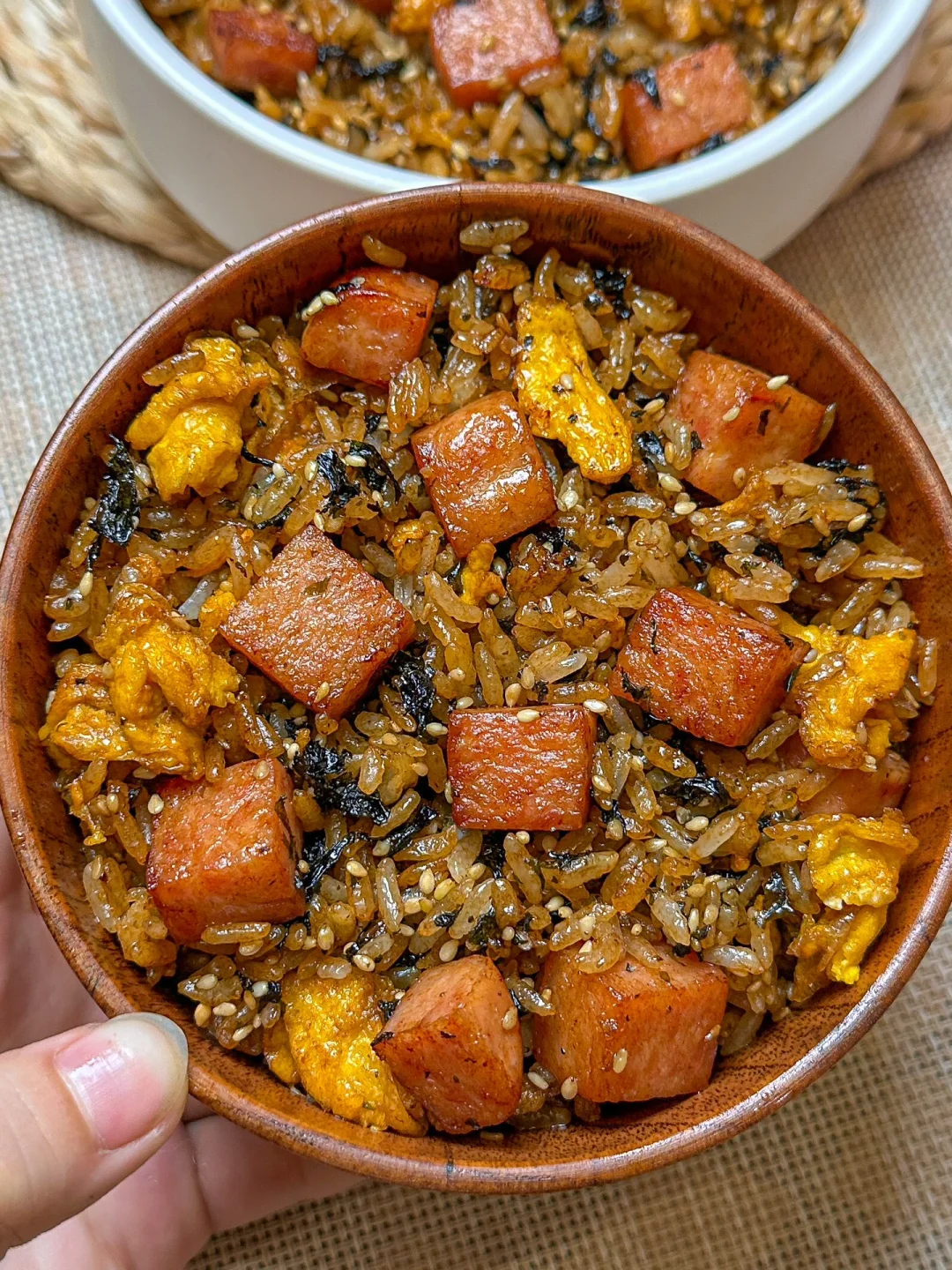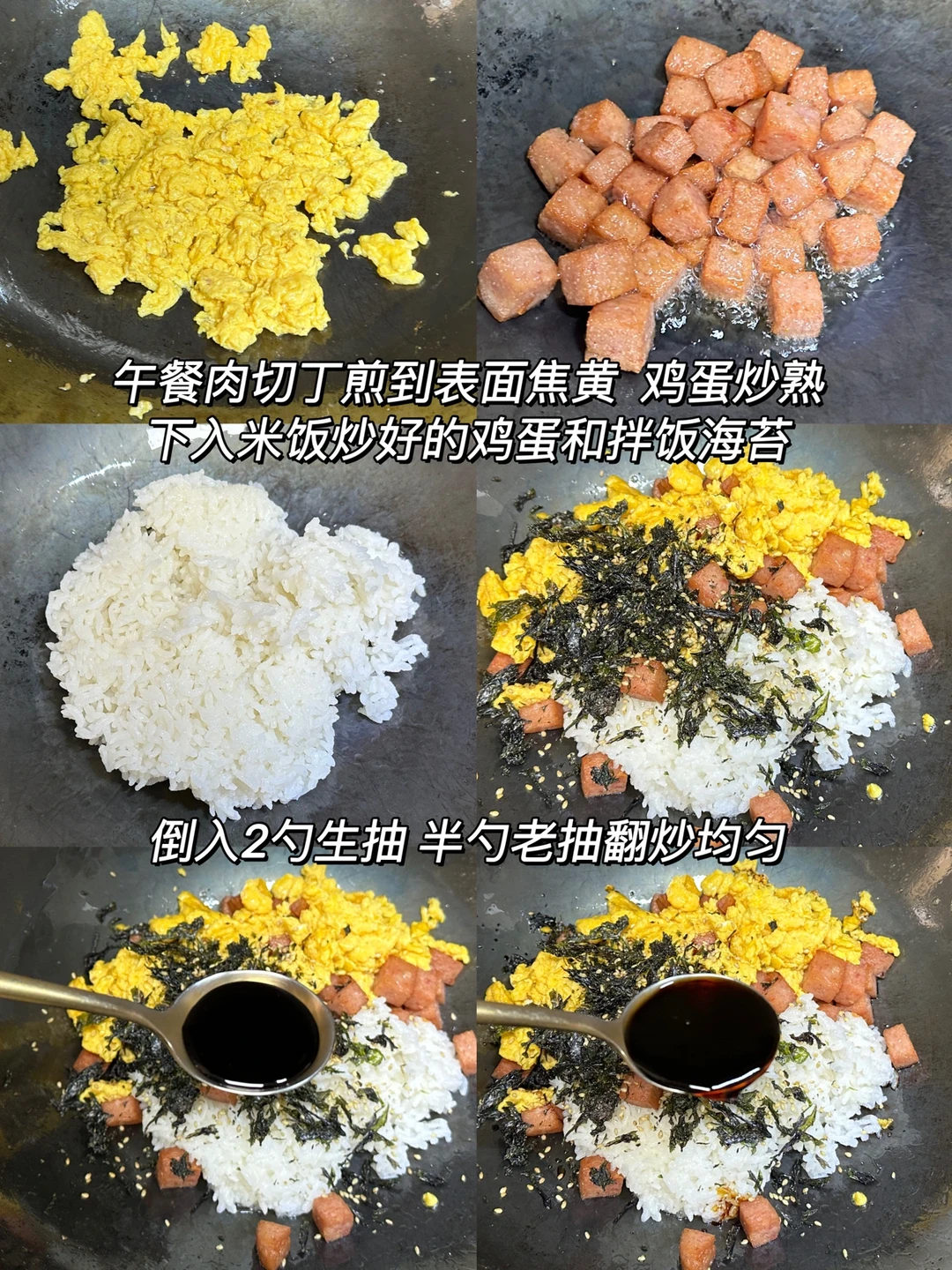 1️⃣午餐肉切丁煎到表面焦黄鸡蛋炒熟