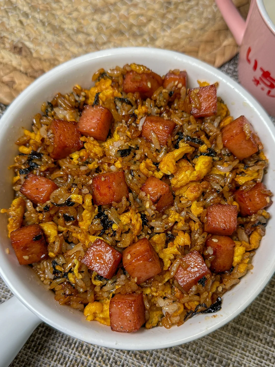 2️⃣下入蒸好的米饭炒好的鸡蛋和拌饭海苔,倒入2勺生抽半勺老抽翻炒均匀