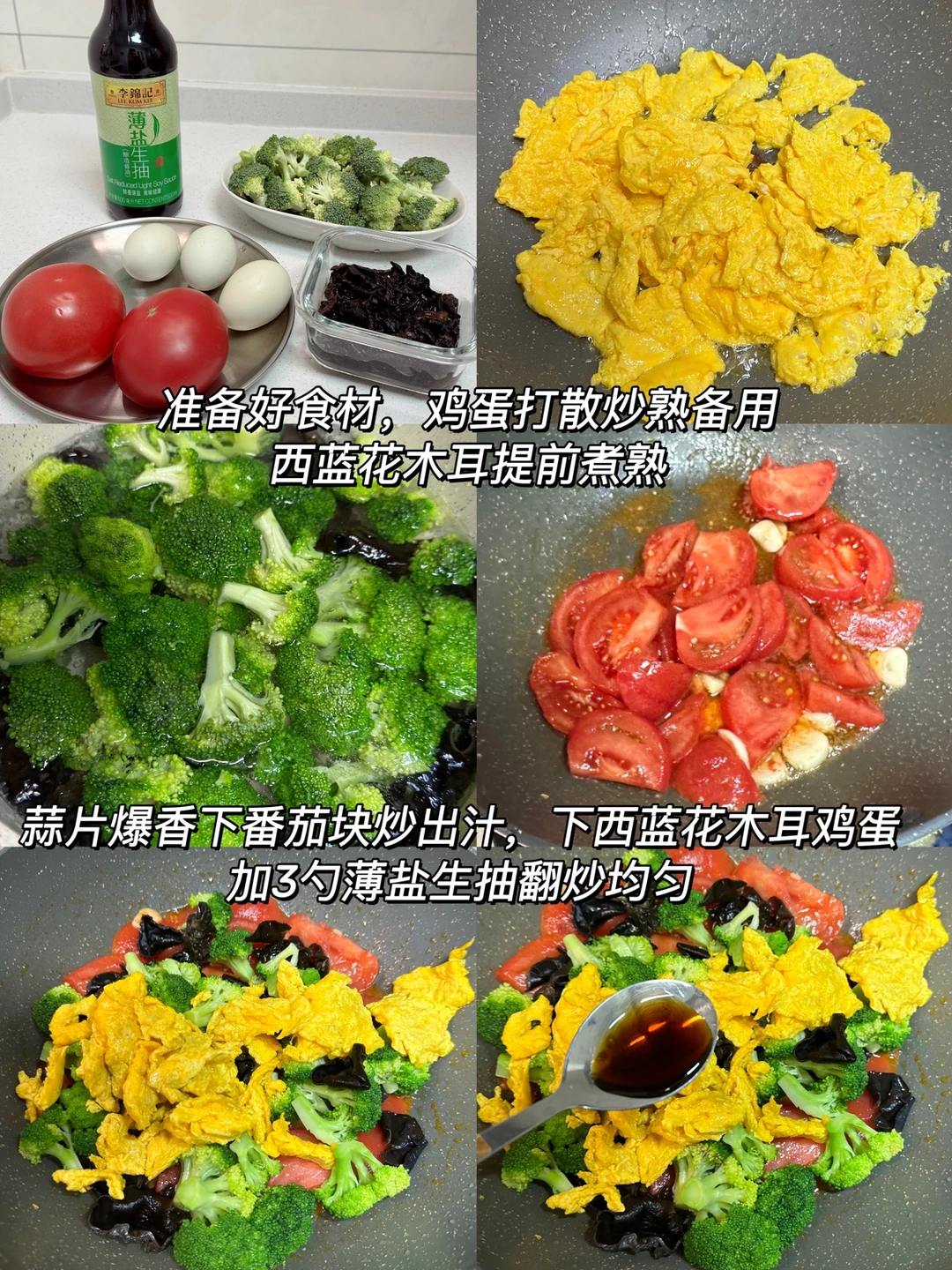 2️⃣爆香蒜末后下番茄超软,下入西蓝花木耳鸡蛋,加2勺薄盐生抽,1勺蚝油和黑胡椒粉炒匀出锅