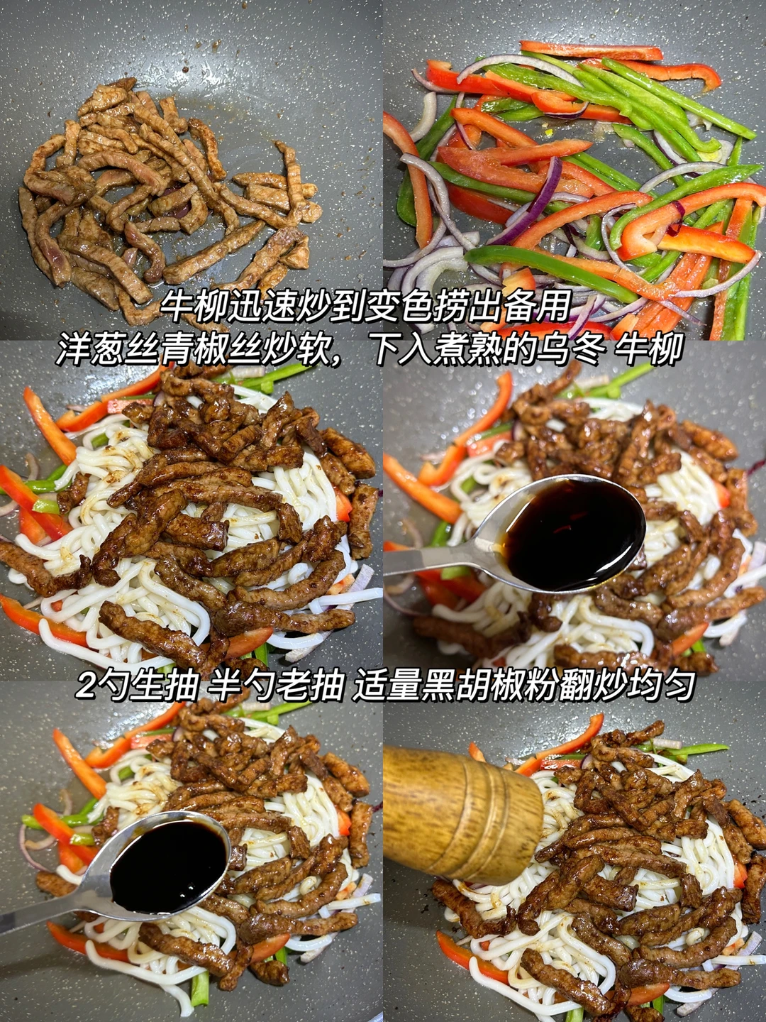 2️⃣牛柳迅速炒到变色捞出备用,洋葱丝青椒丝炒软,下入煮熟的乌冬和牛柳,加2勺生抽 半勺老抽 适量黑胡椒粉翻炒均匀