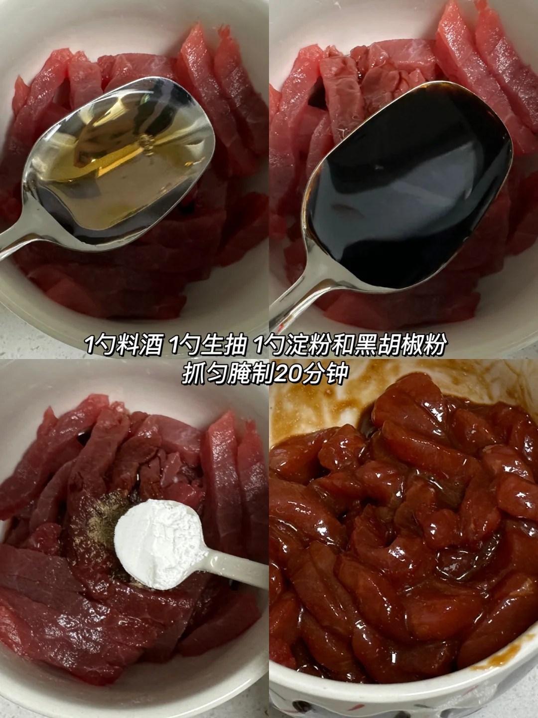 1️⃣1勺料酒 1勺生抽 1勺淀粉和黑胡椒粉,抓匀腌制20分钟
