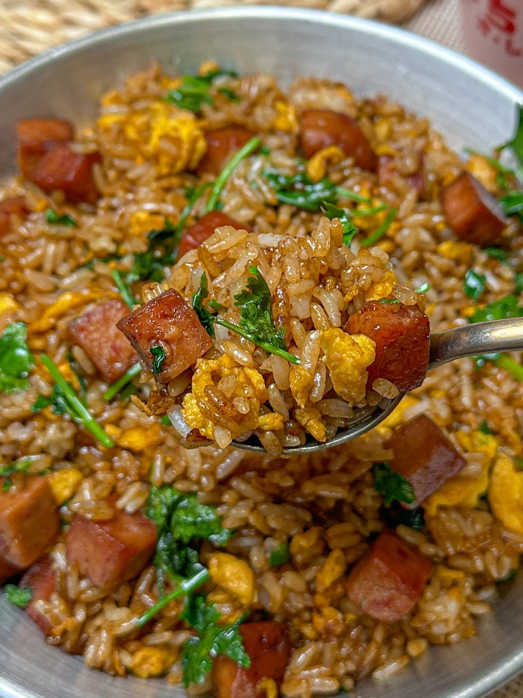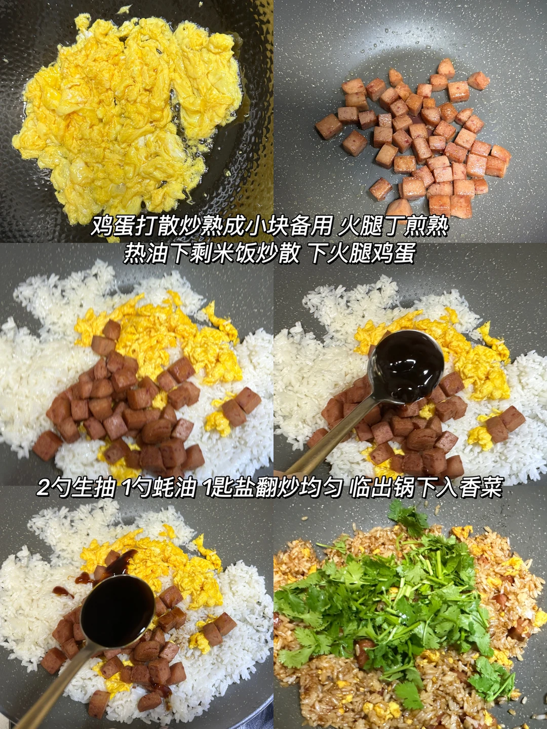 2️⃣热油下剩米饭炒散 下火腿鸡蛋,2勺生抽 1勺蚝油 1匙盐翻炒均匀,临出锅下入香菜段