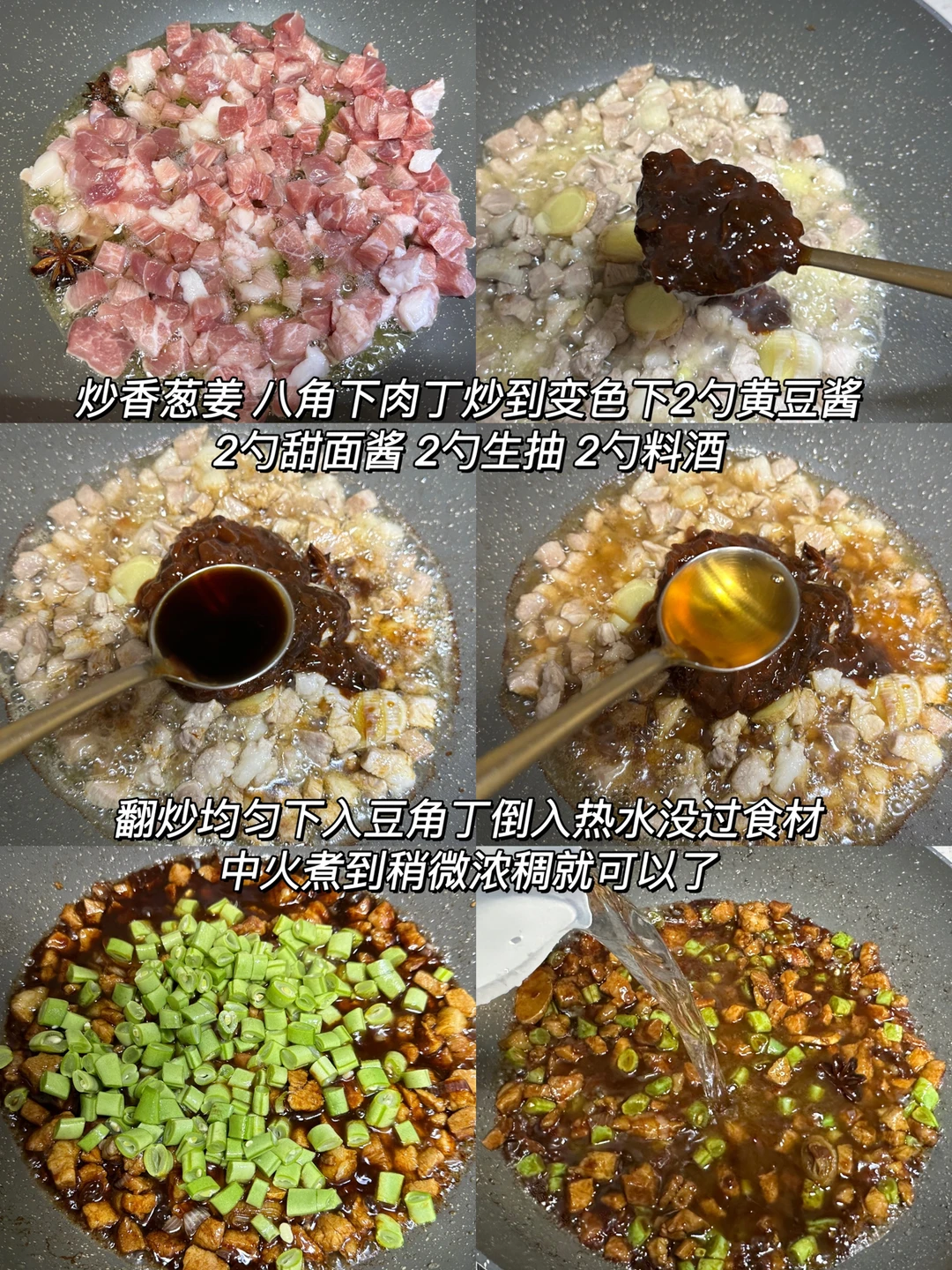 1️⃣ 炒香葱姜八角,下肉丁炒到变色下2勺黄豆酱 2勺甜面酱 2勺生抽2勺料酒