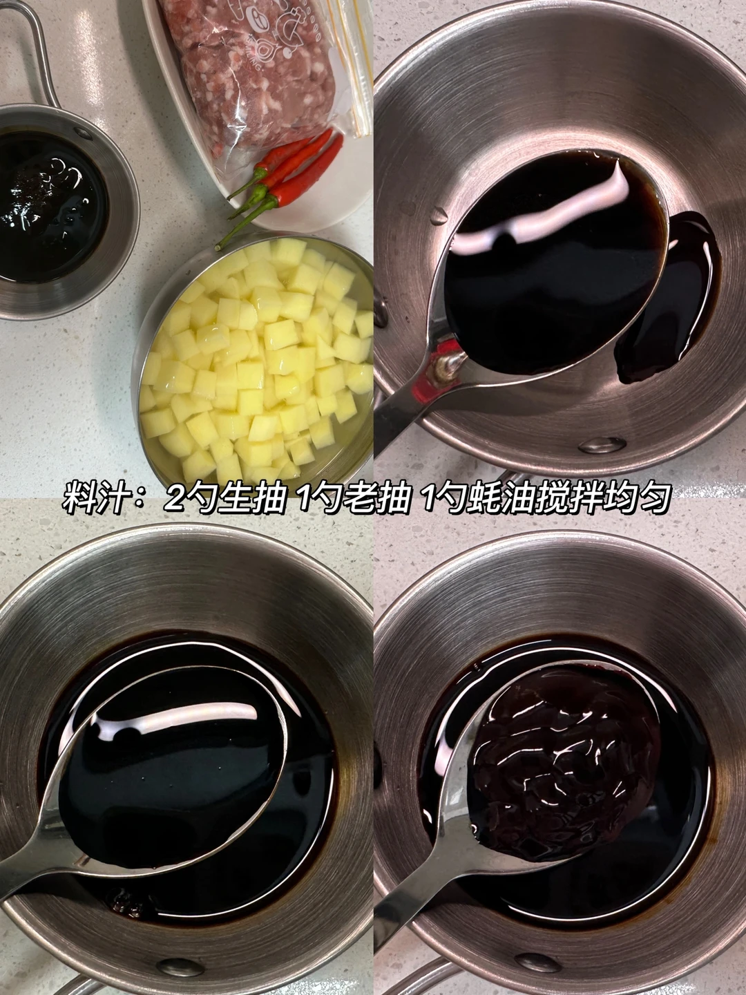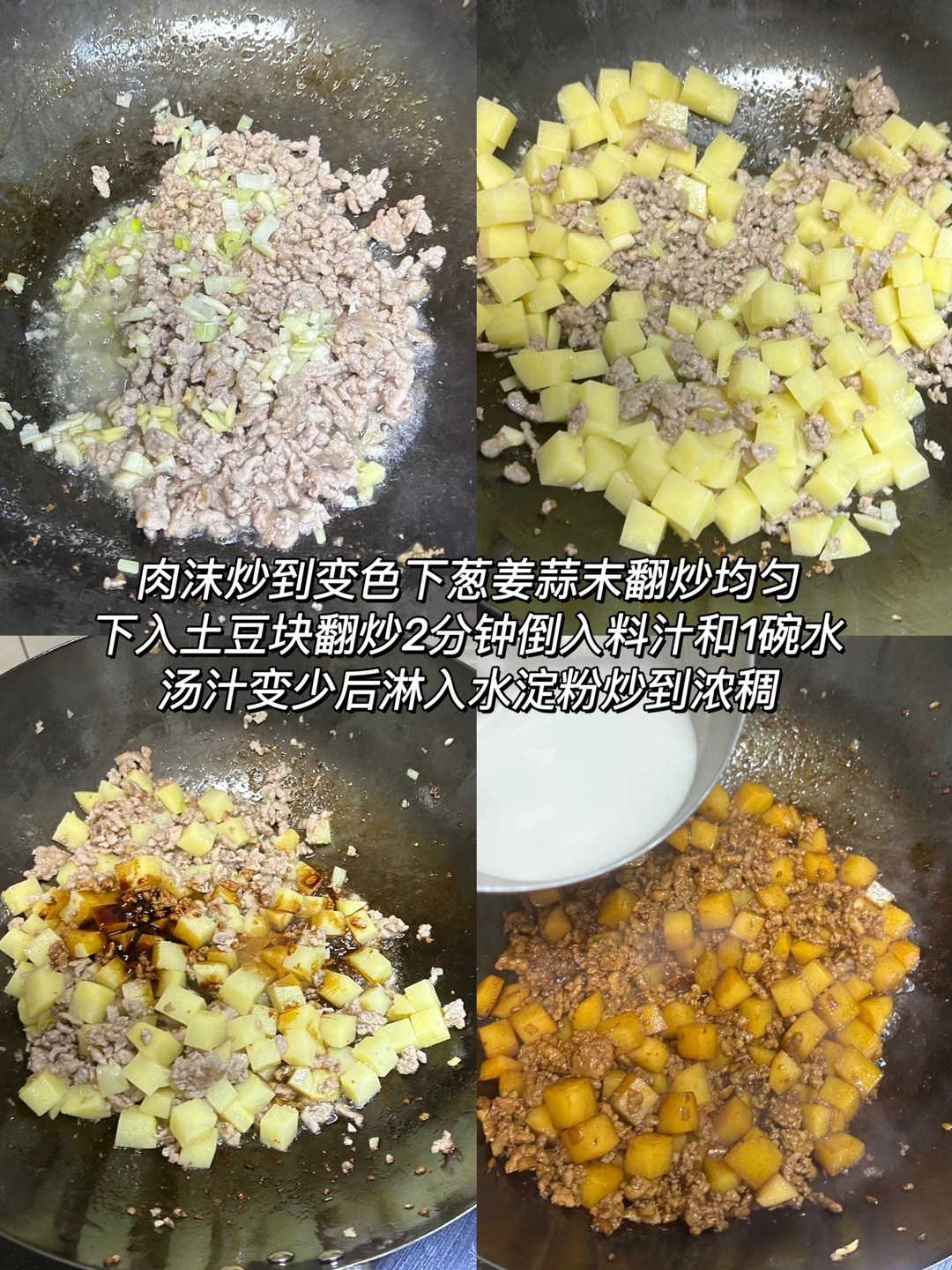 2️⃣肉沫炒到变色下葱姜蒜末翻炒均匀下入土豆块翻炒2分钟倒入料汁和1碗水