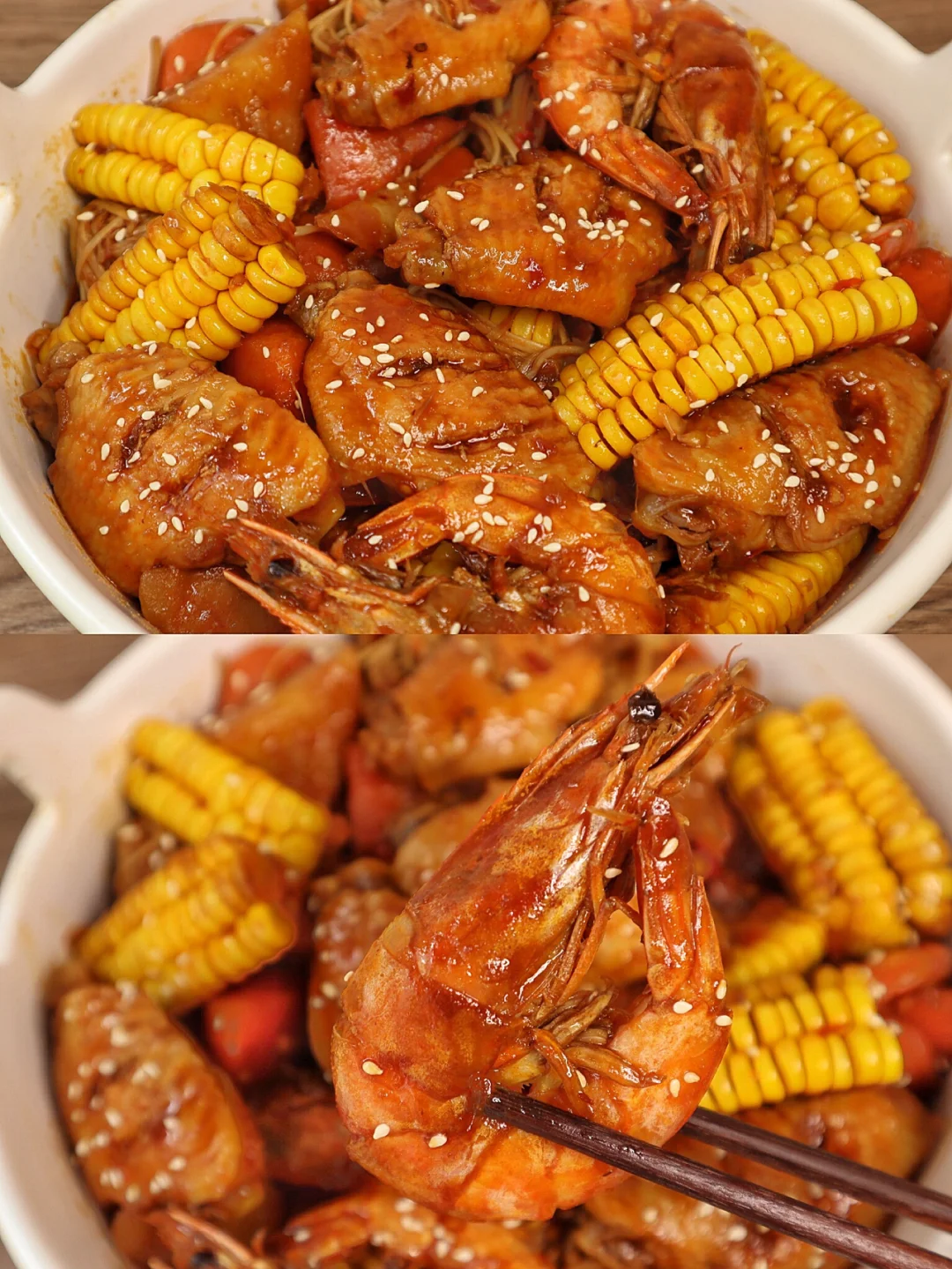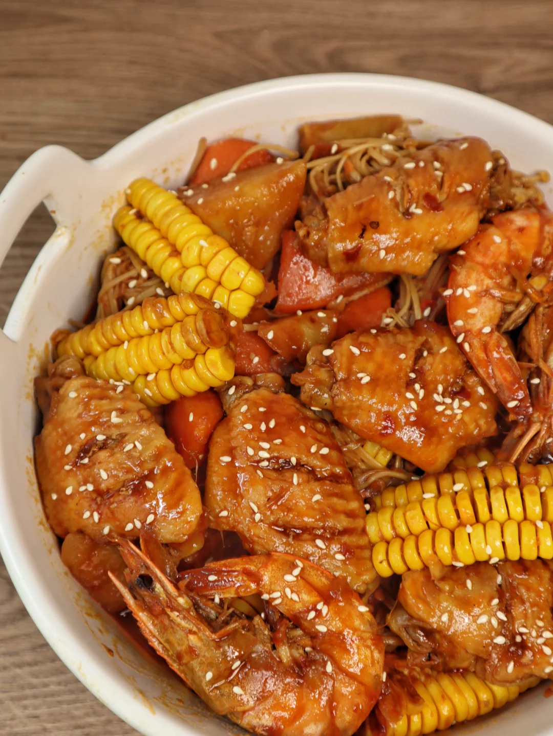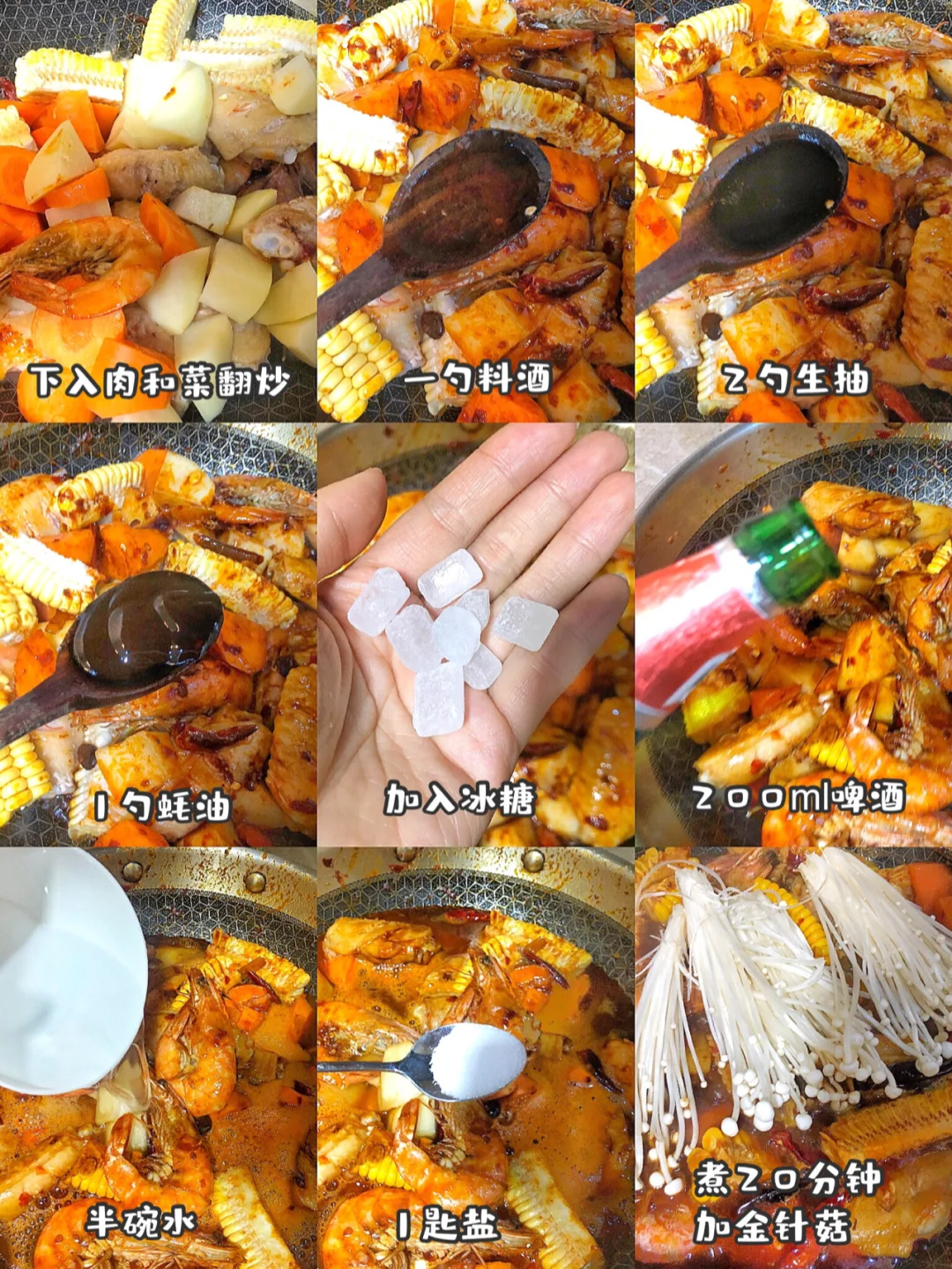 鸡翅300g 大虾200g 胡萝不 土豆 金针菇 啤酒