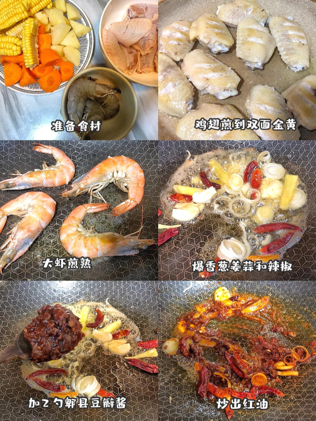 1⃣️鸡翅双面划刀口煎到双面金黄备用,大虾煎熟备用