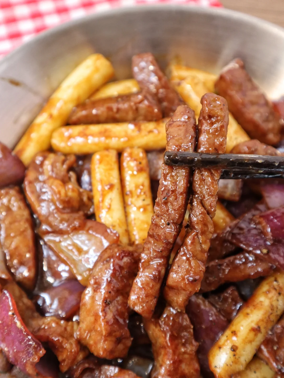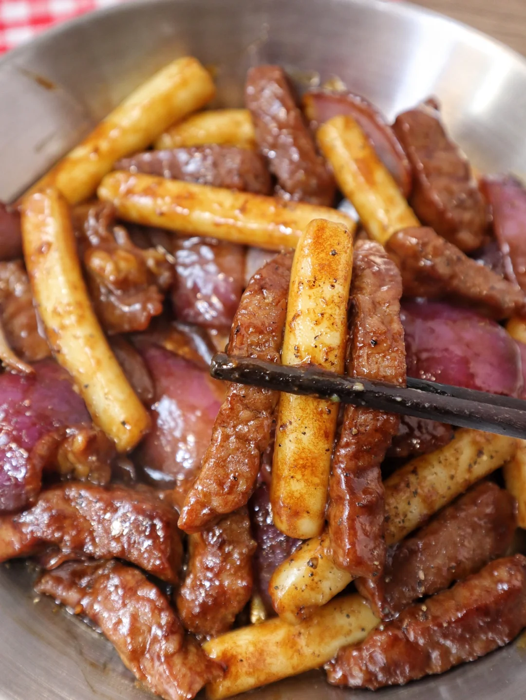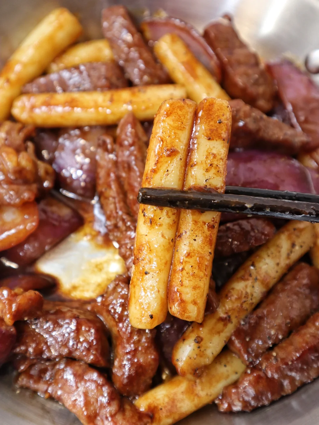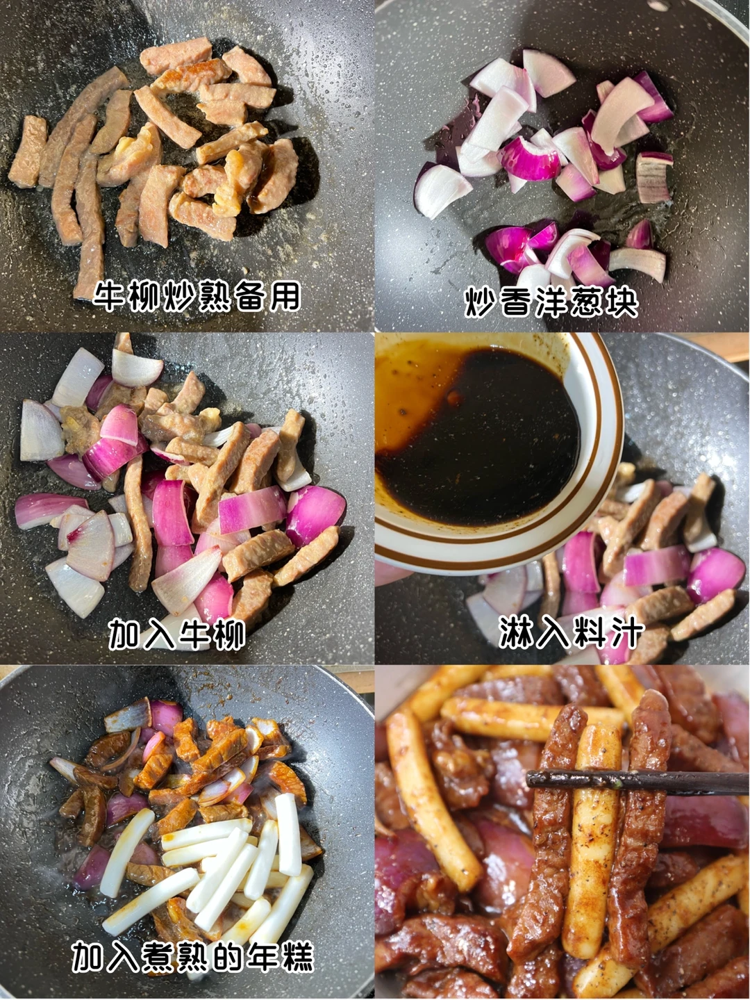 3️⃣洋葱炒香下牛柳,倒入料汁,翻炒均匀后下煮熟的年糕收汁就好啦
