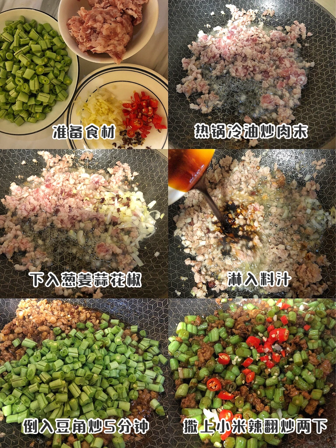 2️⃣豆角切小段 五花肉剁成肉末 葱姜蒜切末 小米辣切圈