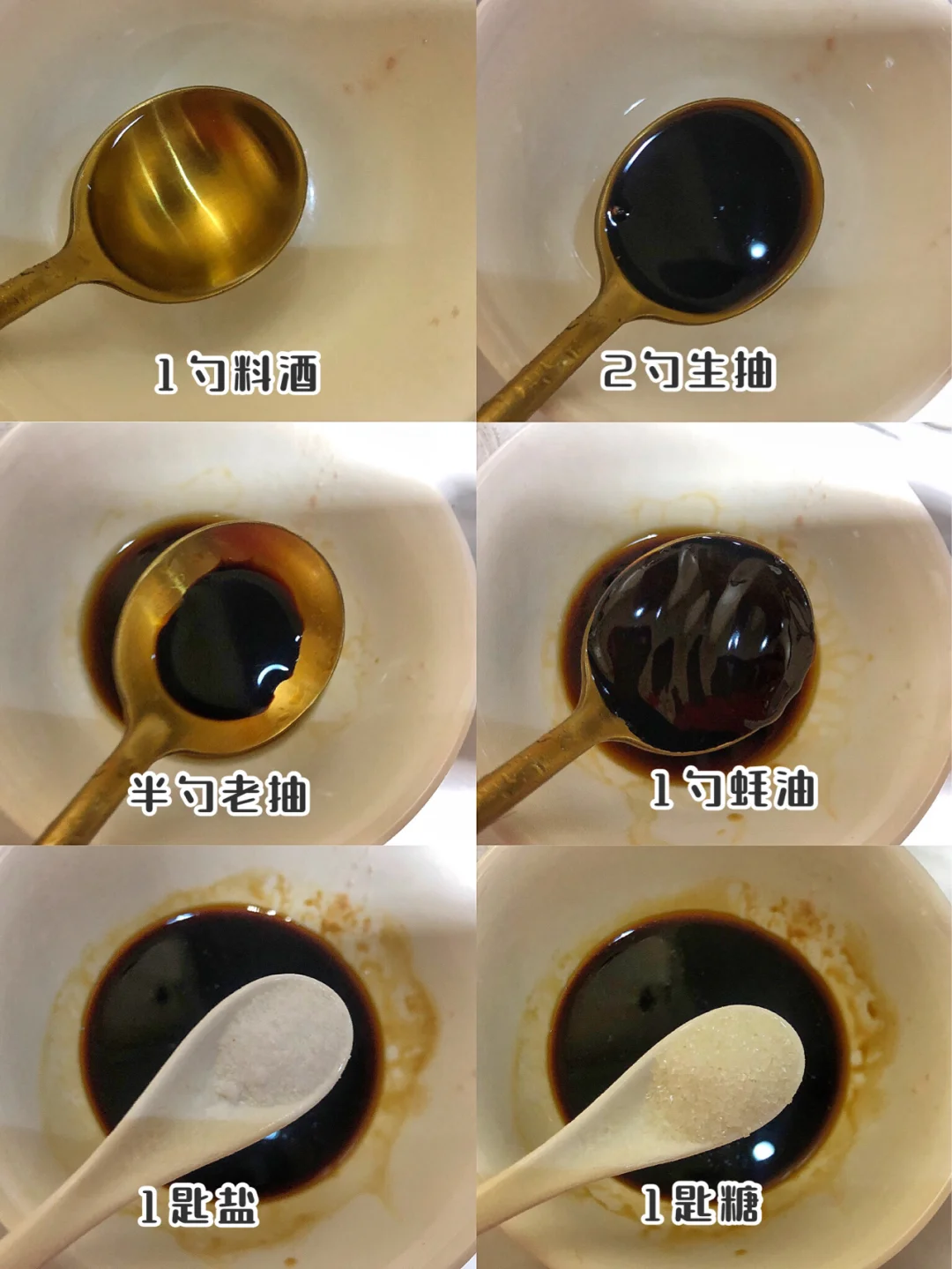 1️⃣调料汁:1勺料酒 2勺生产 半勺老抽 1勺蚝油 1匙盐 1匙糖,搅拌均匀